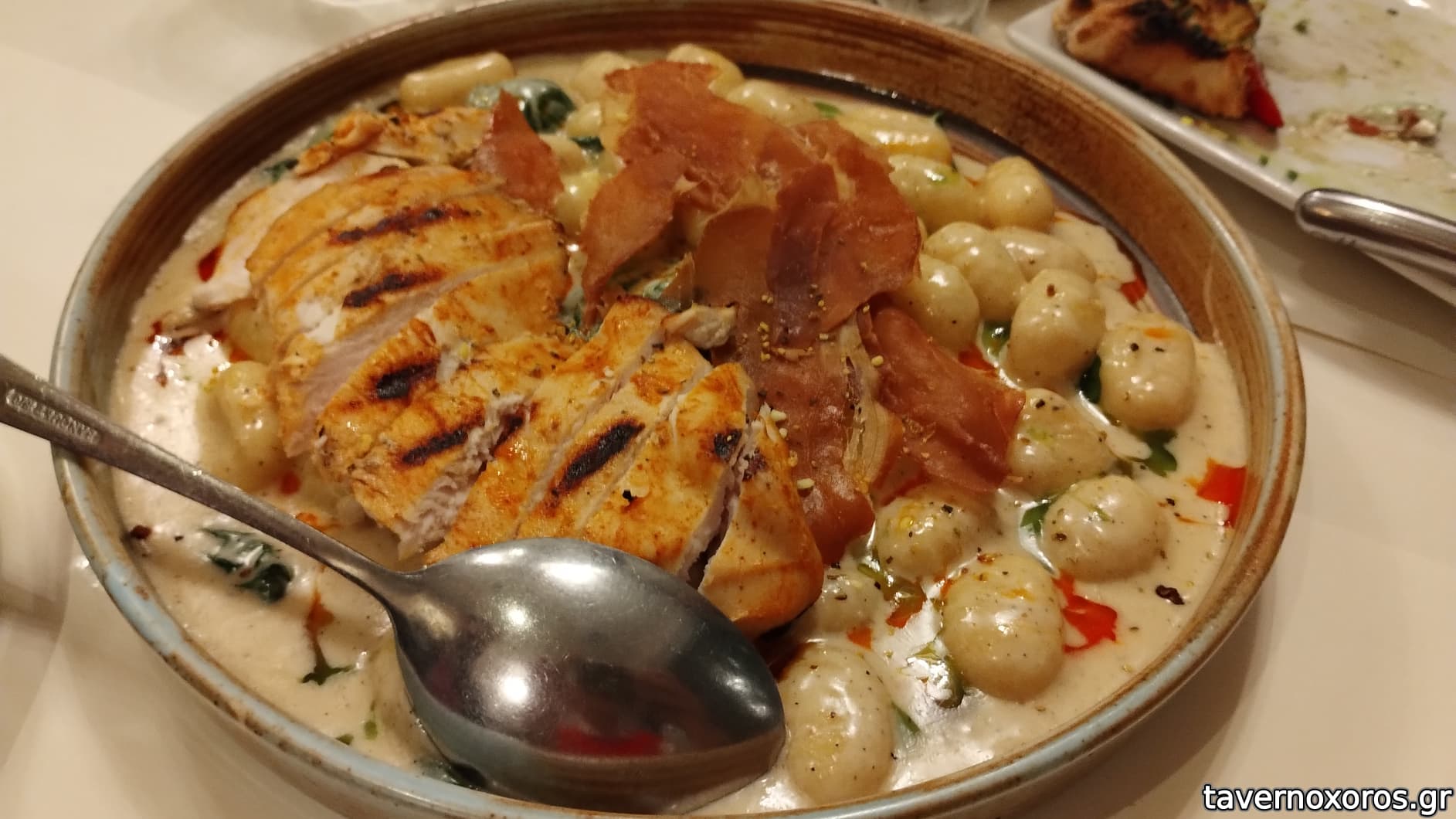 Νιόκι με κοτόπουλο σπανάκι και τσιπς προσούτο (ωραία, με ευχάριστη μαστιχωτή γεύση)