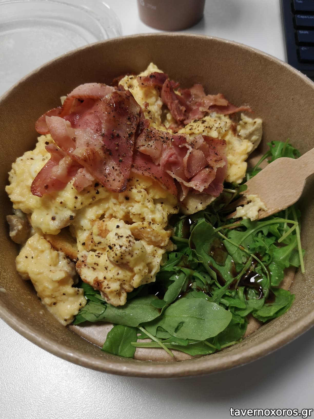 Πολύ τίμιες επιλογές για πρωινό. Scrambled eggs με μανιτάρια και μπέικον πάνω σε μπριός, με συνοδεία λίγης πράσινης σαλάτας στα 4€. Αρκετά καλή ποσότητα, γευστικά μια χαρά. Στα συν το ότι ακόμα και η σαλάτα ήταν προσεγμένη, με το αλατάκι της και το μπαλσάμικό της. Θα ξανατιμηθεί.