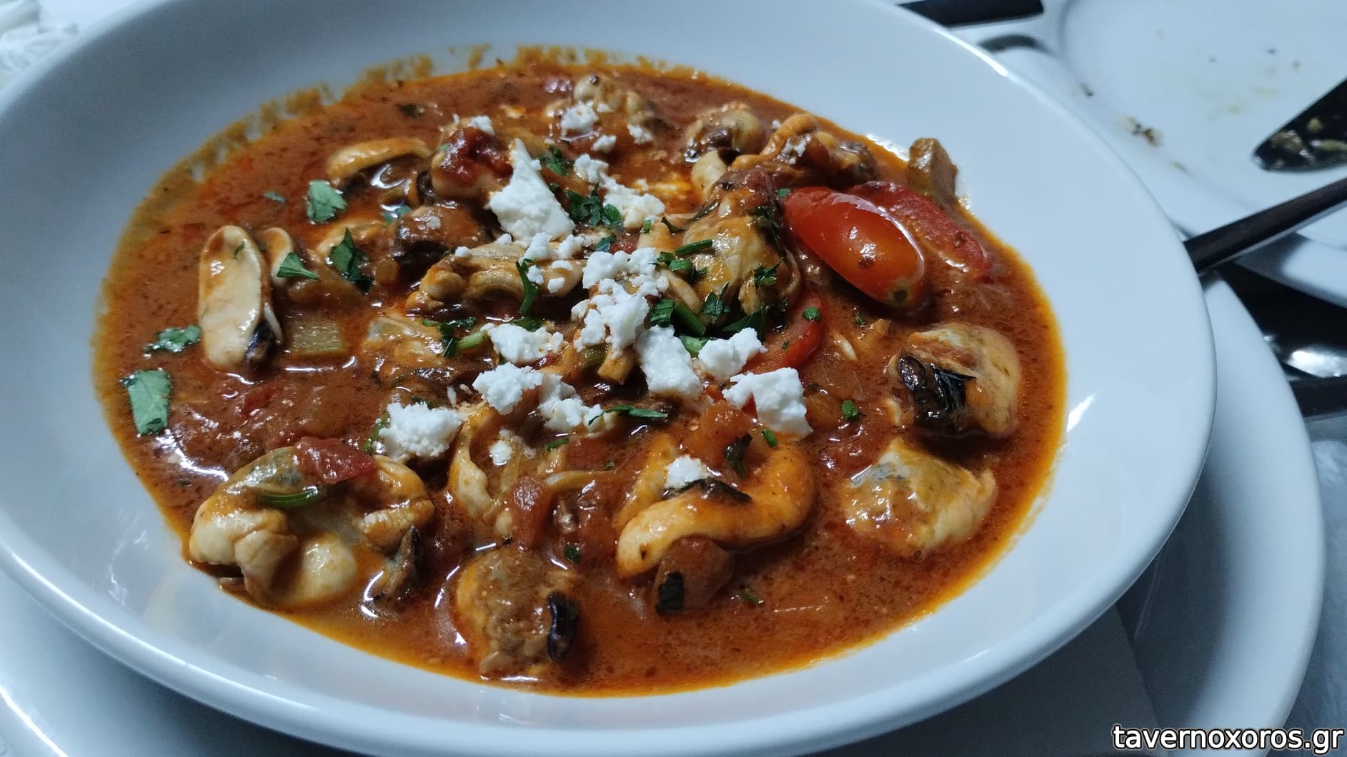 Μύδια σαγανάκι (πιθανώς με κονκασέ, αλλά καλή σάλτσα, πιπεράτη)