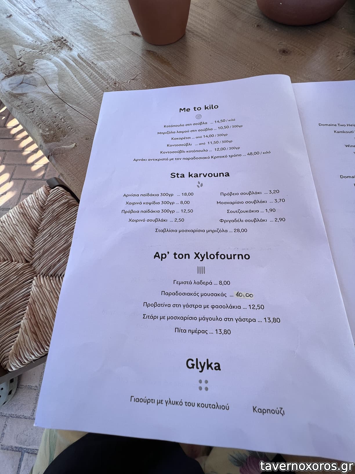 κύριο και μοναδικό λόγο στο μενού έχουν ο ξυλοφουρνος, οι σουβλες, τα αντικριστά κρέατα (με την αυστηρή Κρητικη τεχνική), και τα φαγητά απευθείας σε ανοιχτή φωτιά, τα προζυμενια ψωμιά και αλλά) και ειναι ένα ουσιαστικά from farm to table εστιατοριο (γιατί έχουμε φάει και πολύ παπά όλα αυτα τα χρόνια με τον όρο from farm to table) όπου τα κηπευτικα και τα μποστάνια δεν είναι διακοσμητικά…. αλλά συμμετέχουν στη διαδικασία του εστιατορίου ως προϊόντα