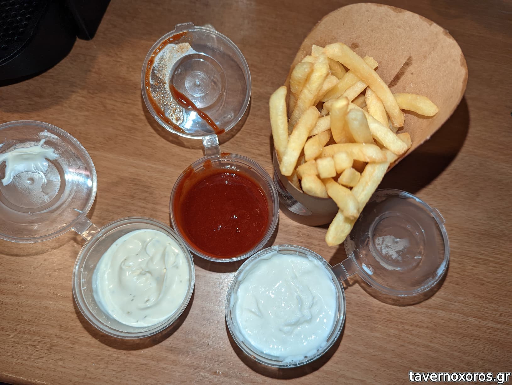 Πατάτες (μια χαρά, τύπου Goody's) & dips "potato" (καλή) & "extra hot" (μια χαρά) & "feta" (όχι του γούστου μου)