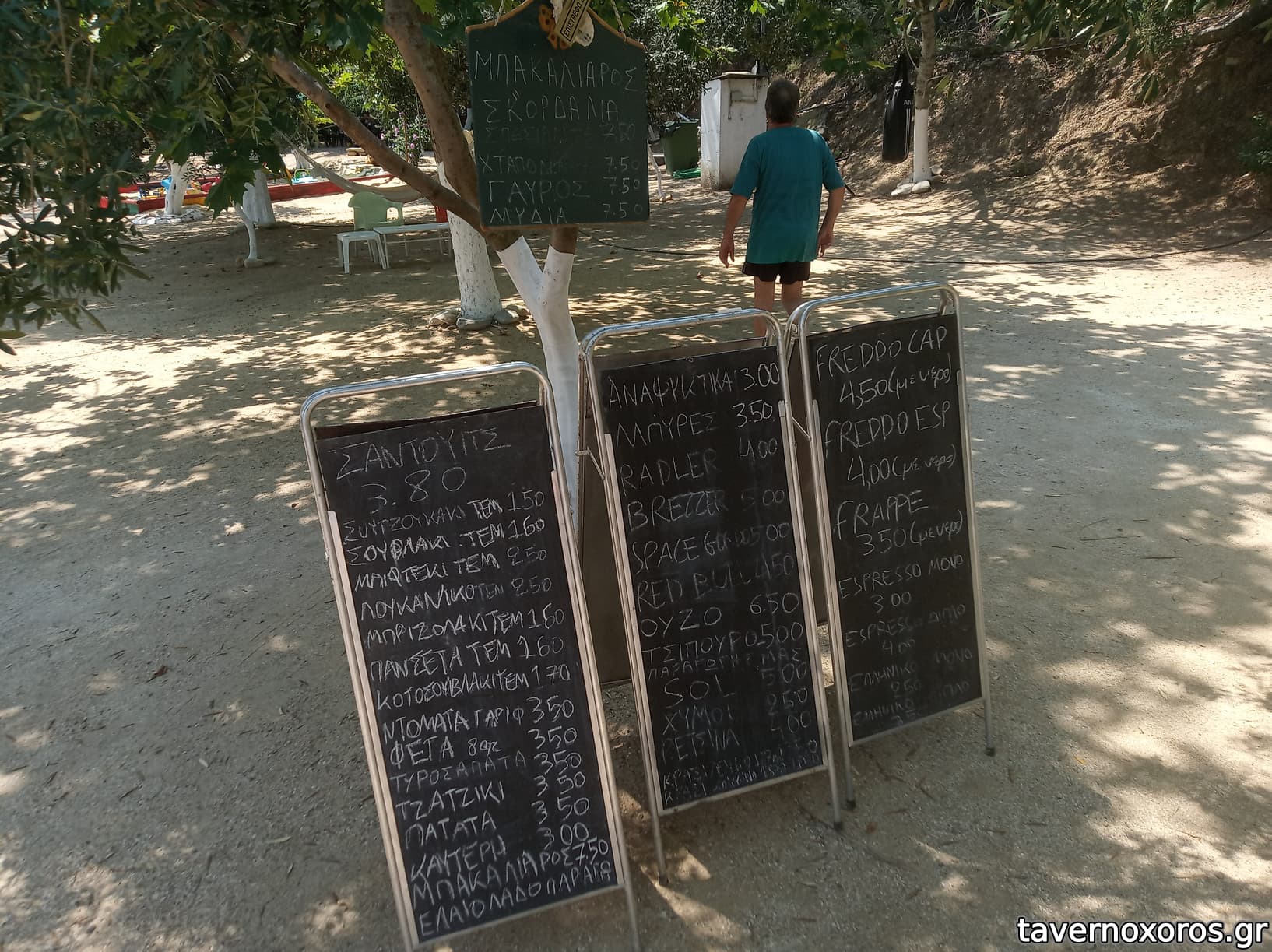 Δεν έφαγα, αλλά είδα τα φαγητά να πηγαινοέρχονται και μου έκαναν καλή εντύπωση. Έχουν και κρεατικά και λίγα ψαρικά. Αναρτώ κατάλογο από πίνακα. Τραπεζάκια κάτω από δροσερά δέντρα και κάποια σε ομπρέλες με θέα την παραλία, διαλέγετε και παίρνετε.