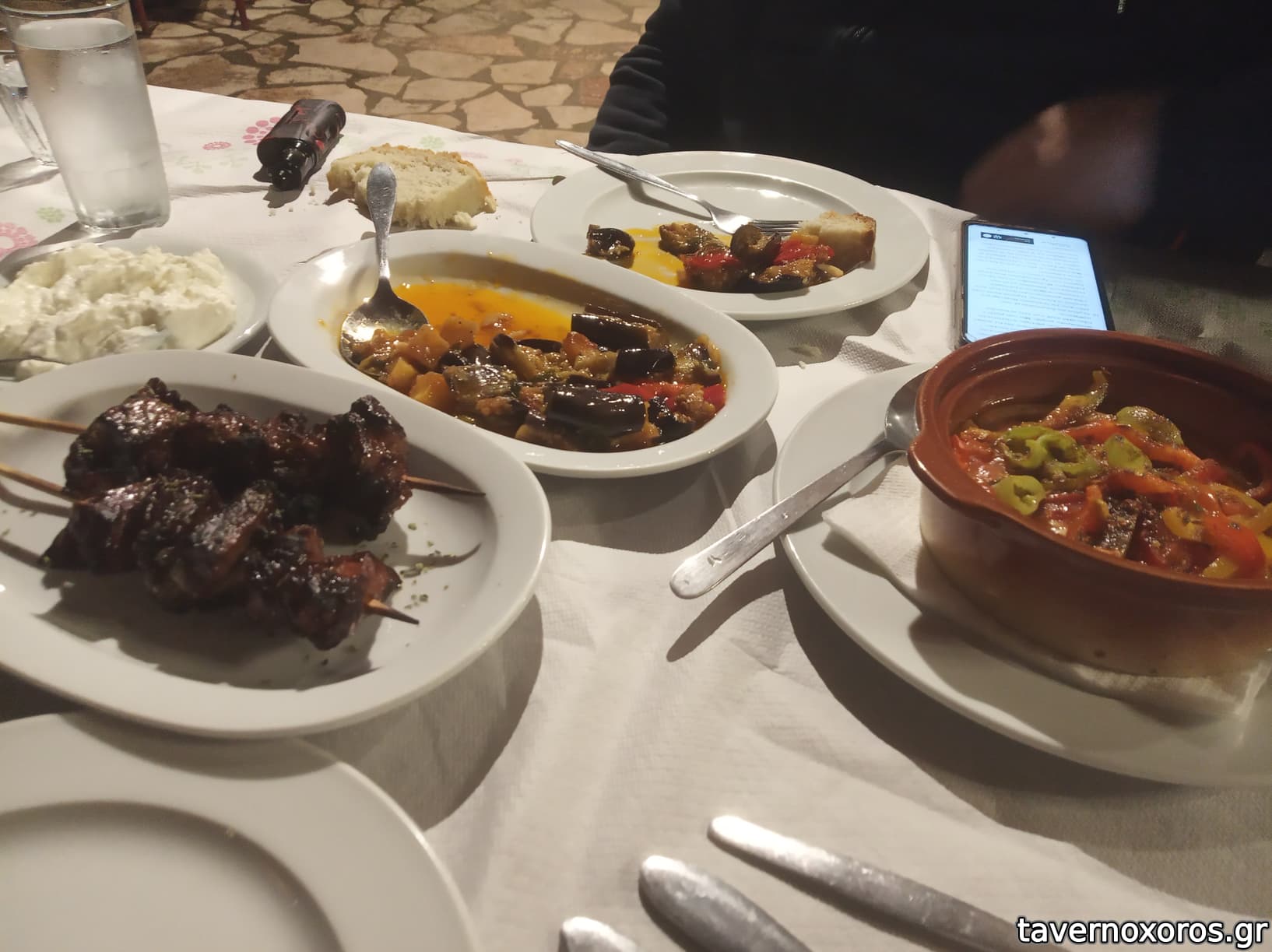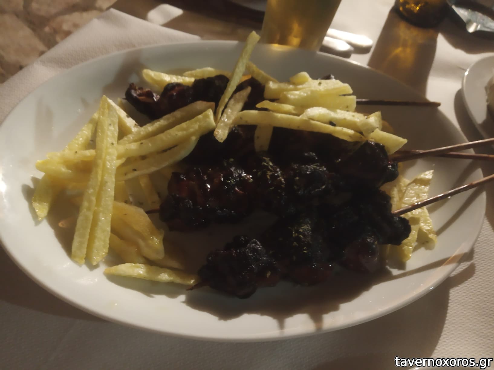 Έχει διάφορους μεζέδες, αλλά η κύρια ατραξιόν είναι τα ψητά του Κώστα. Ο ίδιος ανάβει κάρβουνα στη γωνιά του, έξω, δίπλα στα τραπέζια, και επιμελείται. Με δοκιμές καταλήξαμε ότι έχει Φρυγαδέλι, συκώτι τυλιγμένο με σκέπη σε ξυλάκι. Και το δουλέψαμε αρκετά, και το προτείνω.