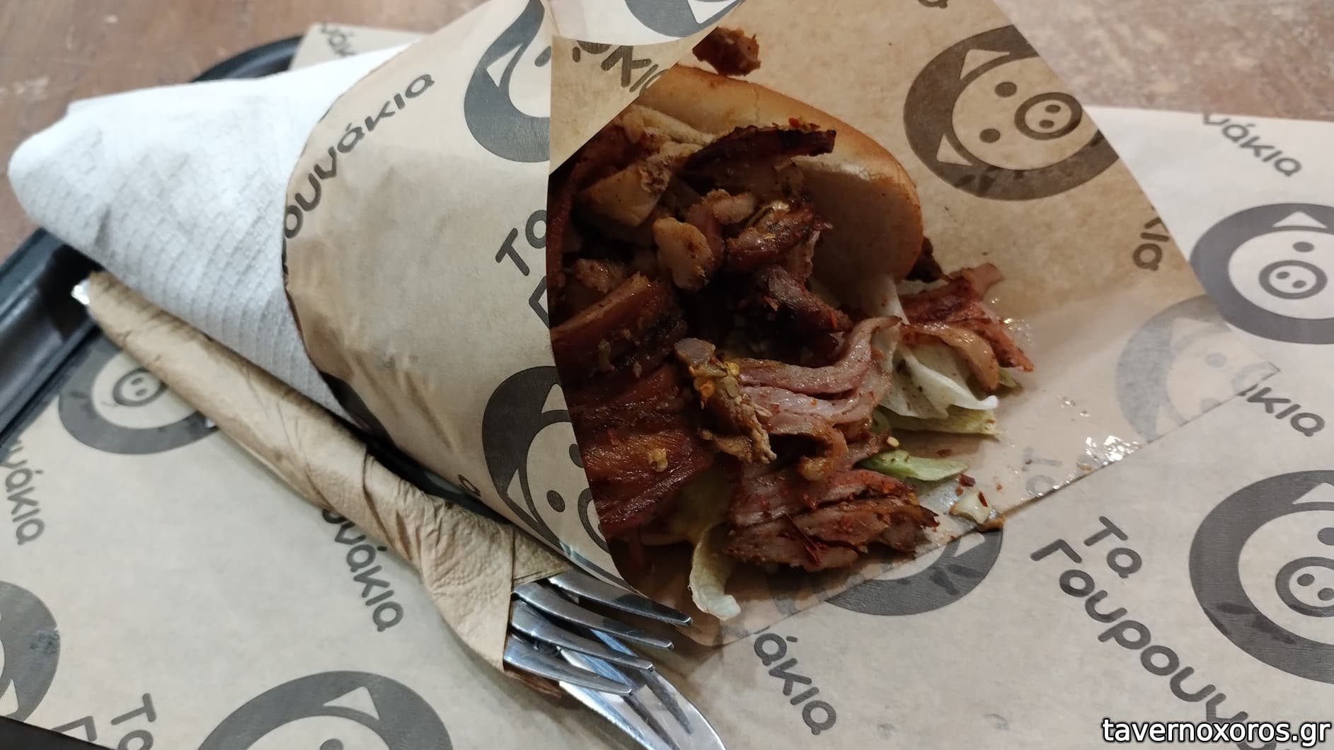 Ψωμάκι με γύρο χοιρινό (ο γύρος ήταν στα τελευταία του και είχε στεγνώσει, αλλά όλα τα υπόλοιπα ήταν οκ. Γερή ποσότητα. 4,