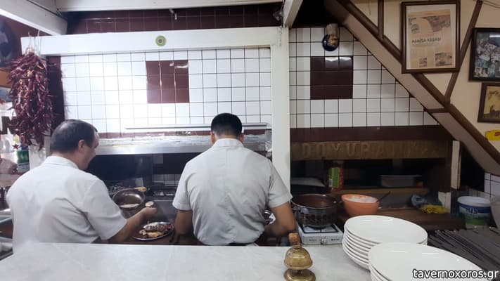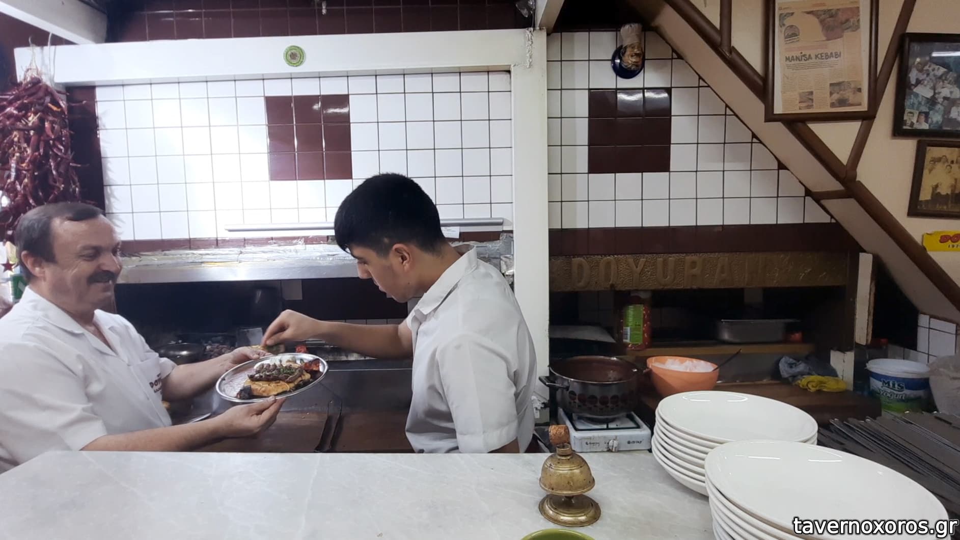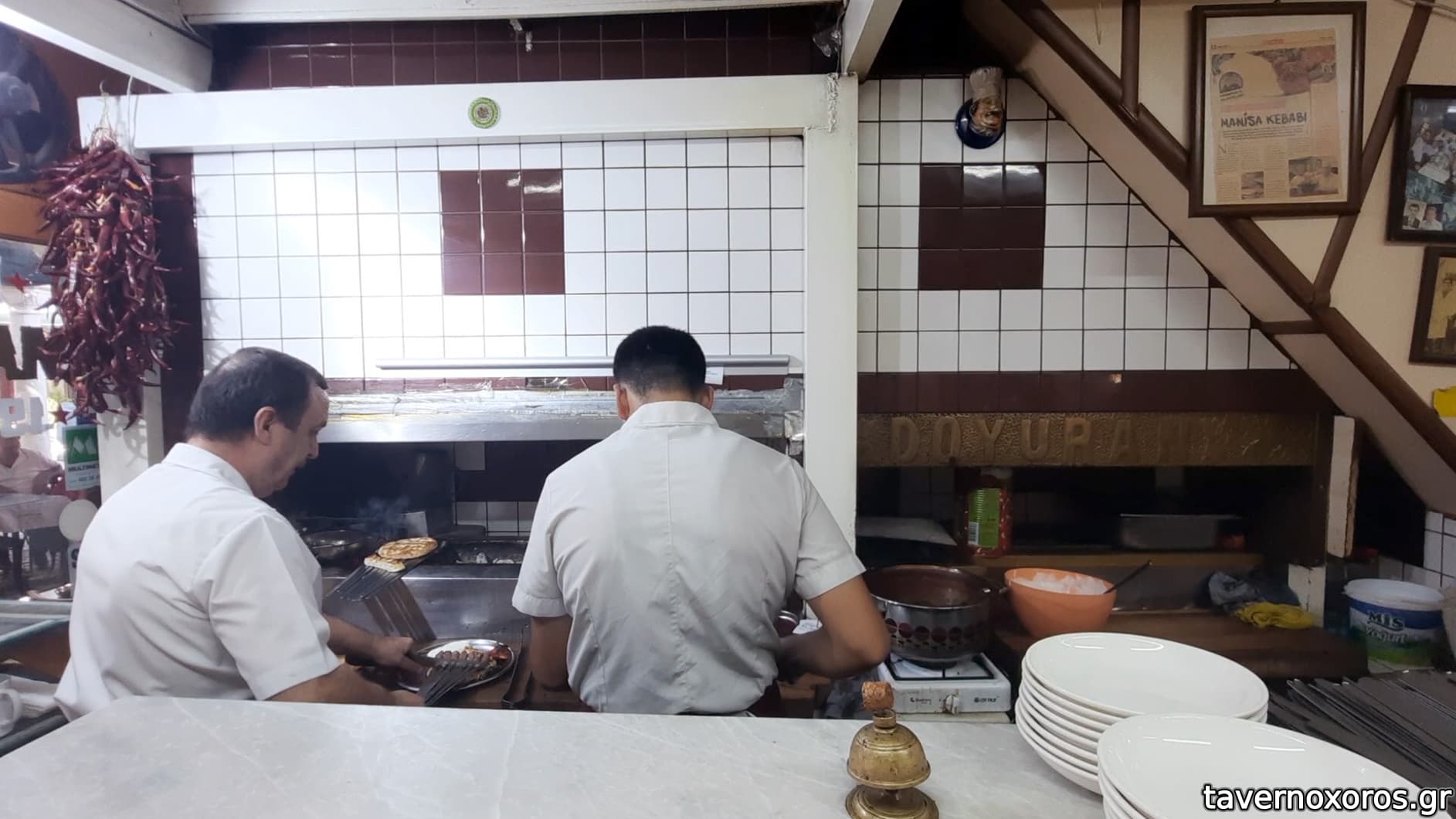 Ο μάστορας βάζει τα μοσχαρίσια κεμπάπ στις πίτες. Δίπλα από τον βοηθό, σαλτσούλα στο κατσαρολάκι.