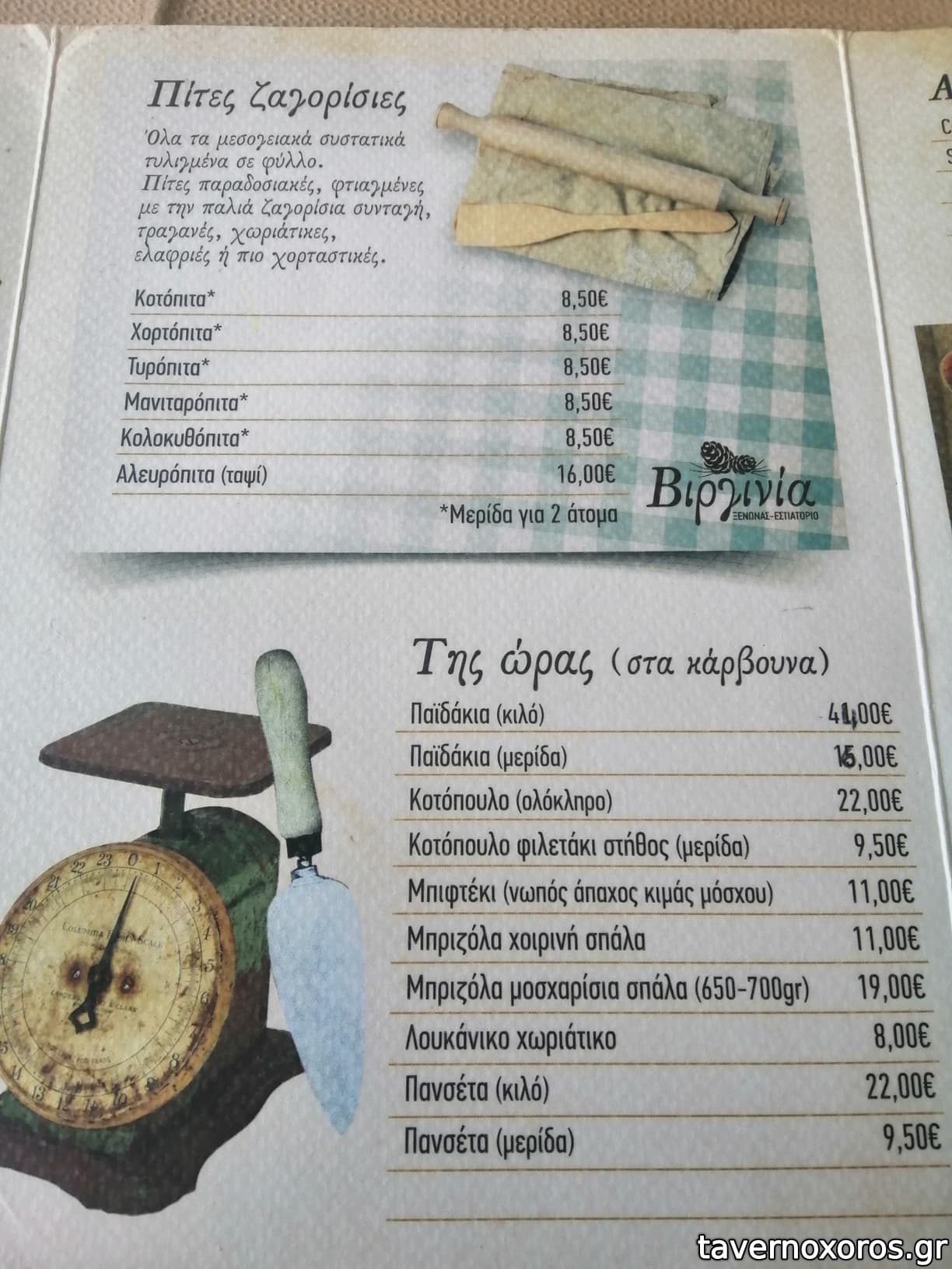 πηραμε μια κοτοπιτα (πολυ καλη), μια χωριατικη(καλη), 1 γαλοτυρι(πολυ καλο), 1/2 κιλο παϊδακια αρνισια(αψογα) και 1/2 κιλο κρασι(οκ) στα 28€. πολυ καλο συνολο αξιζει και προτεινεται.