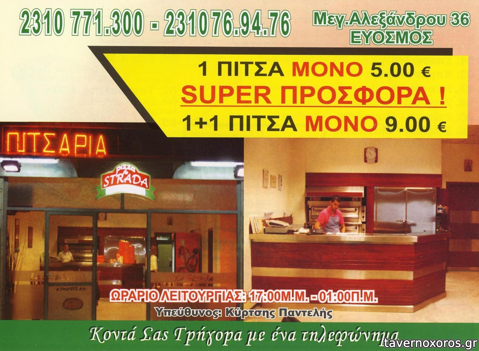 Το μαγαζί δεν είναι κάτι ιδιαίτερο, γενικά δουλεύει με ντελίβερι αν και έχει τραπέζια εκεί και είναι καθαρά και ευχάριστα να κάτσεις. Οι πίτσες είναι ΠΟΛΥ νόστιμες, με καλή ποιότητα κασέρι που δε μυρίζει εμετούλη μετά το φαΐ, και έχουν ένα μέγεθος το οποίο ικανοποιεί περίπου 2 άτομα (1 πίτσα 5 ευρώ).