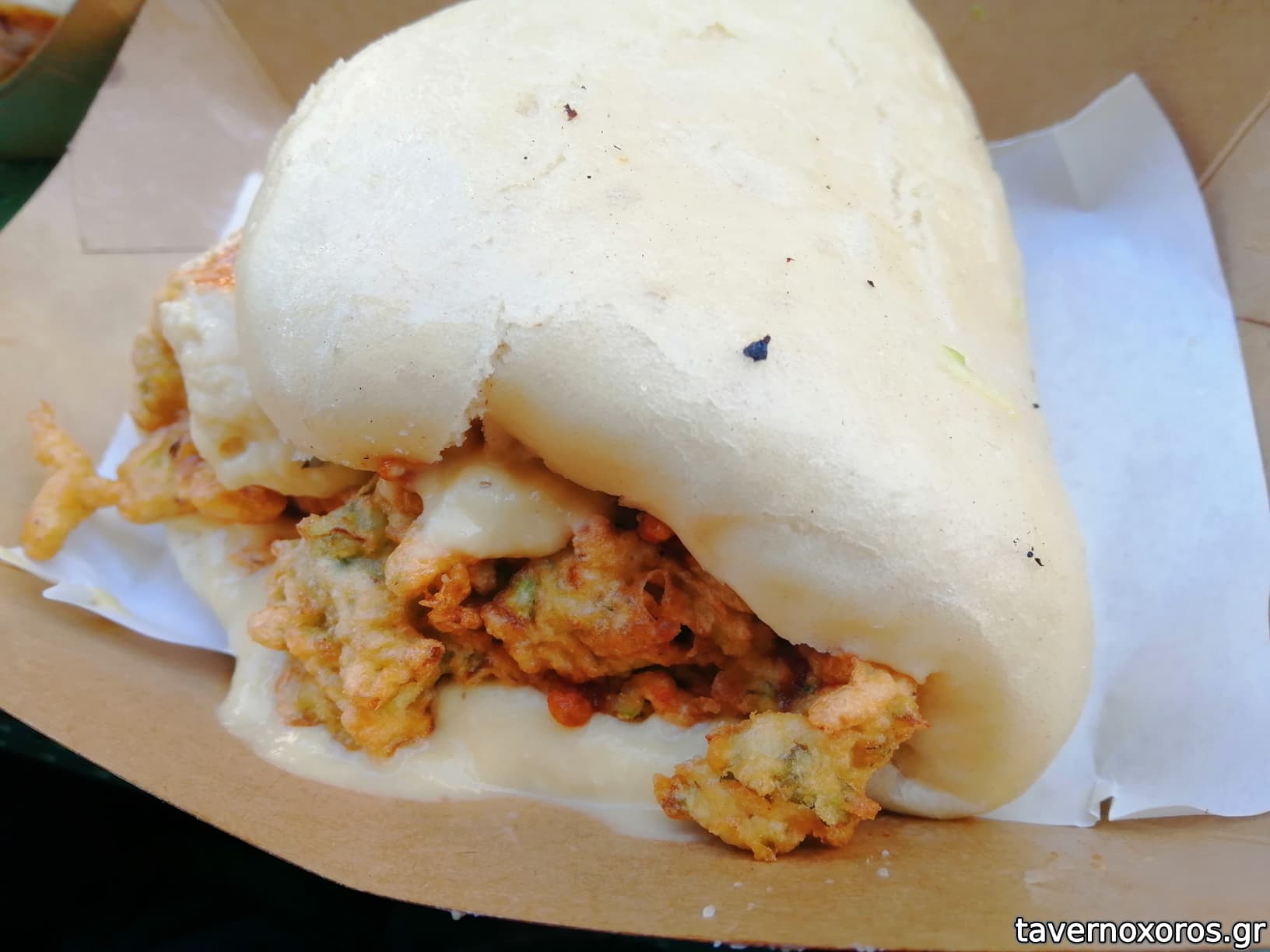 Bao bun burger με belva fried chicken και σως φυστικοβούτυρο (βαρύ και μέτριο)
