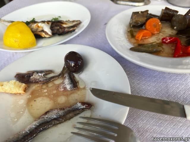 1ο πιάτο: αντζούγια (μέλι), σαφρίδι (καλό), μελιτζάνα τουρσί