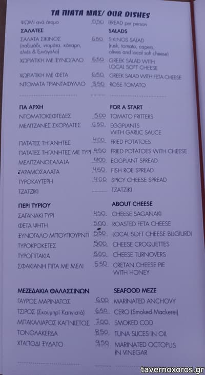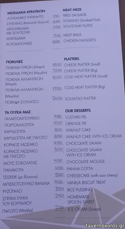 Στο φαγητό, δοκιμάστηκε μπακαλιάρος καπνιστός, ξυνόγαλο μπουγιουρντί, σύγκλινο και κεφτεδάκια και ήταν όλα οκ εκτός από το σύγκλινο που μύριζε. Τιμιότατη πορτοκαλόπιτα με παγωτό. Οι μερίδες μικρές, τύπου μεζές και οι ποικιλίες του πολύ ακριβές. All in all, τίποτα εξαιρετικό. Πιστεύω έχει καλύτερες επιλογές οι χώρα.