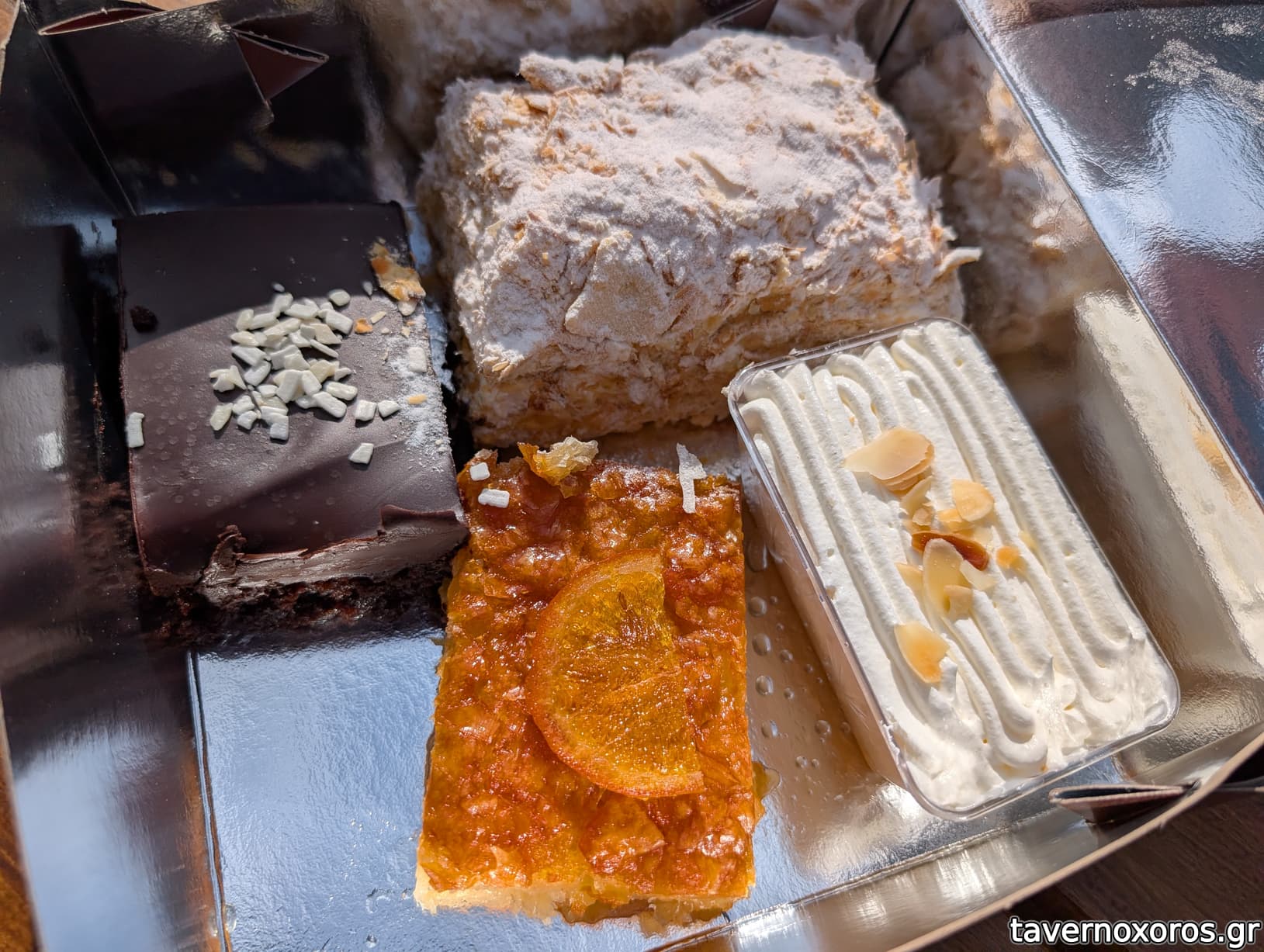 Σοκολατόπιτα (όχι του στυλ μου), Μιλφέιγ (όχι του στυλ μου), Εκμέκ κανταΐφι (απλώς οκ), Πορτοκαλόπιτα (καλή)