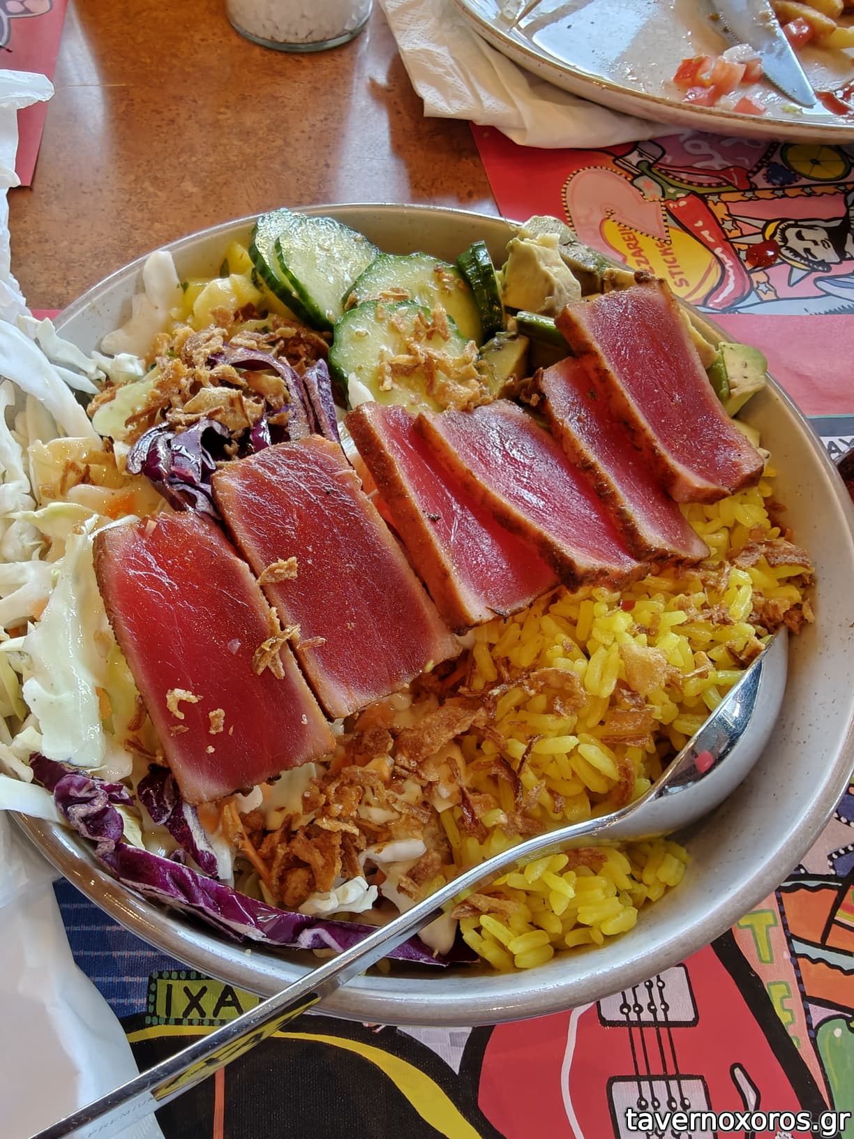 Ahi tuna bowl, πρόκειται για limited edition πιάτο που αποτελείται από Ahi tuna με μπαχαρικά cajun, yellow rice, αβοκάντο, mango pineapple pico, asian style cucumber και spicy lemon dressing