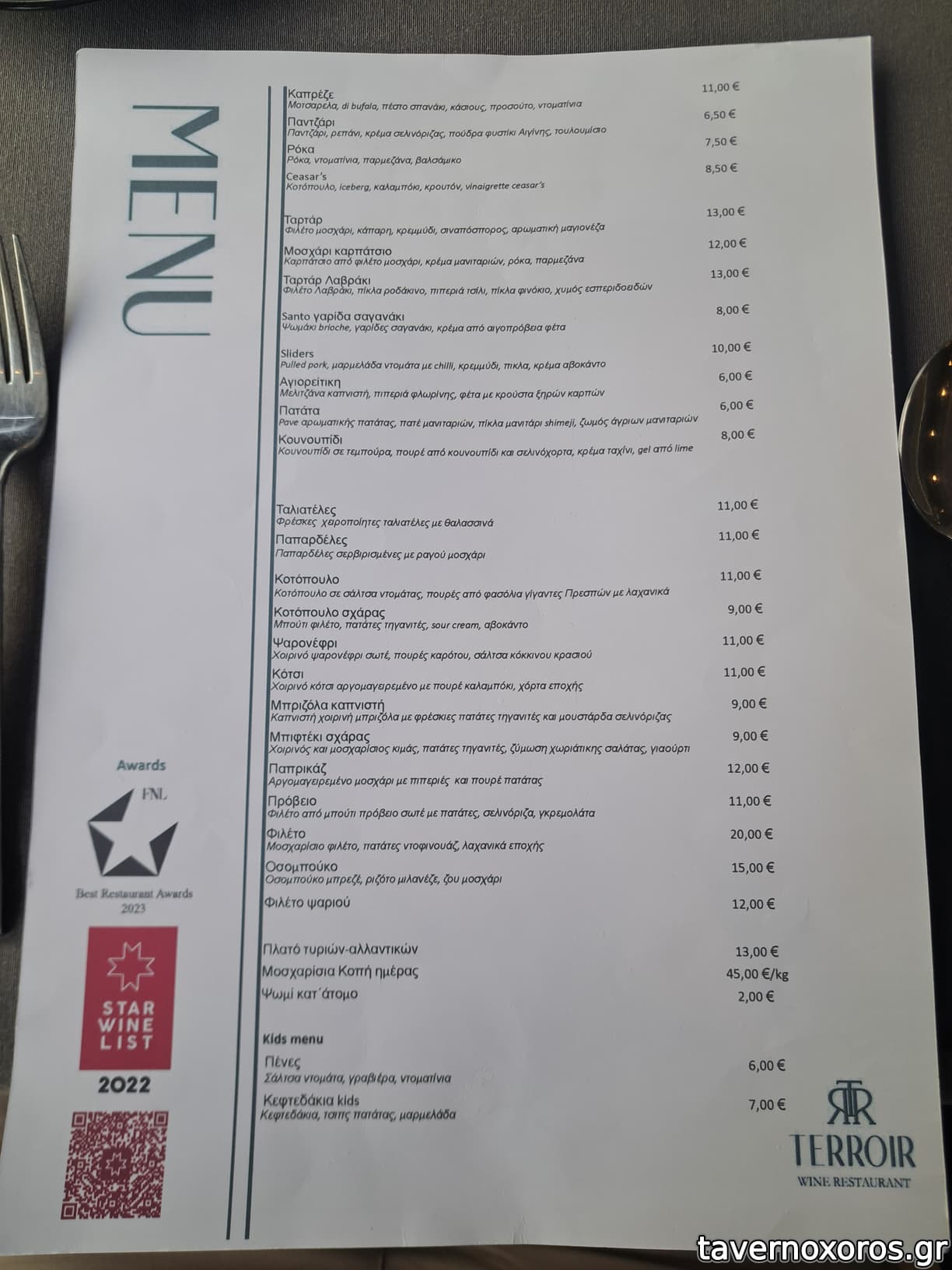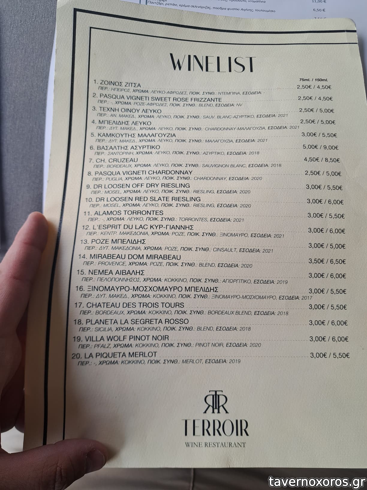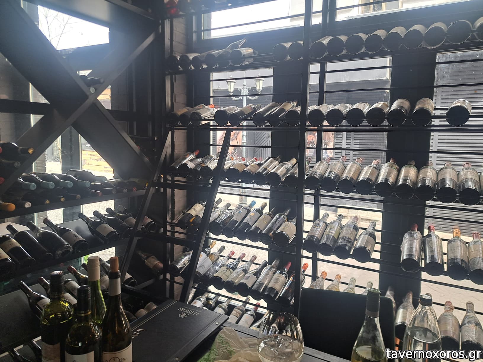Όπως προδίδει το όνομα, η έμφαση δίνεται στο κρασί. Υπάρχουν περίπου 20 επιλογές σε ποτήρι και 490(!) σε φιάλη, καθώς και σομελιέ. Κρασιά προφανώς από Ελλάδα ενώ από ξένα παίζει από Γαλλία και Ιταλία μέχρι Ουρουγουάη και Λίβανο.