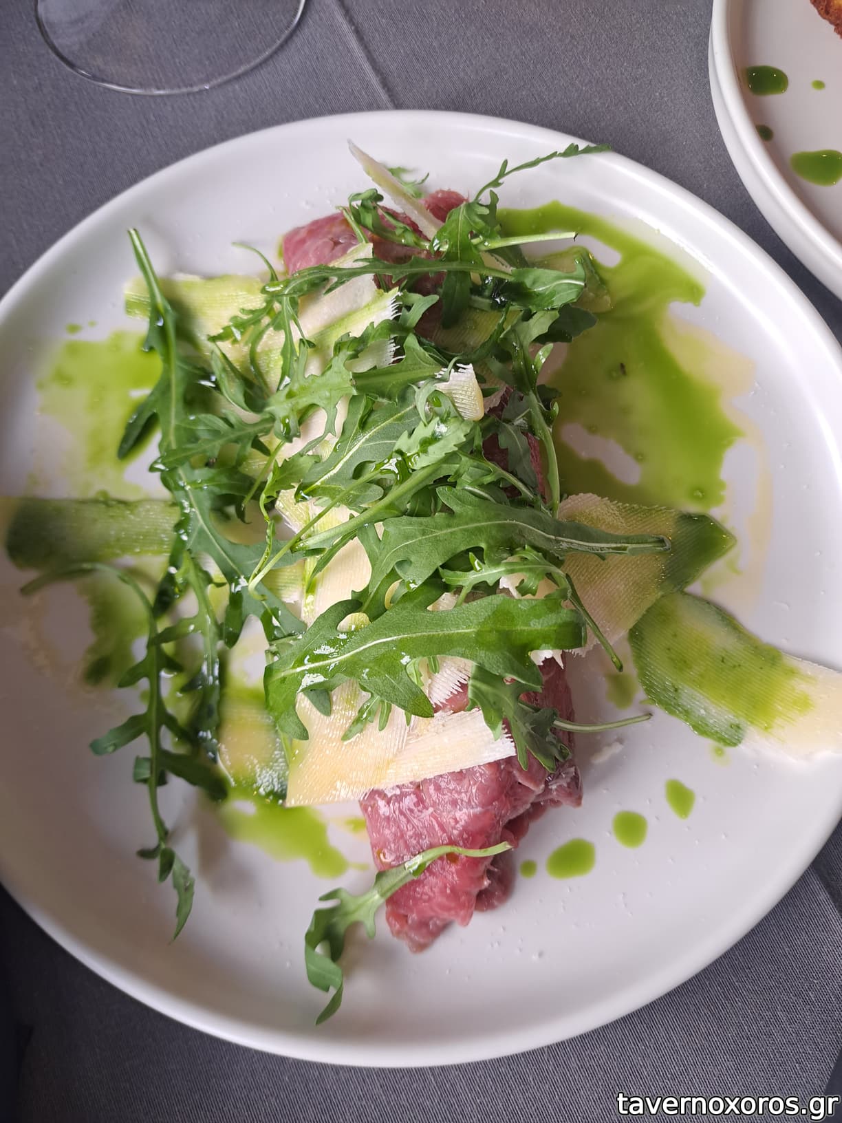 Καρπάτσιο μοσχάρι, ήταν τυλιγμένο γύρω από μια σάλτσα μανιταριών. Καλό.