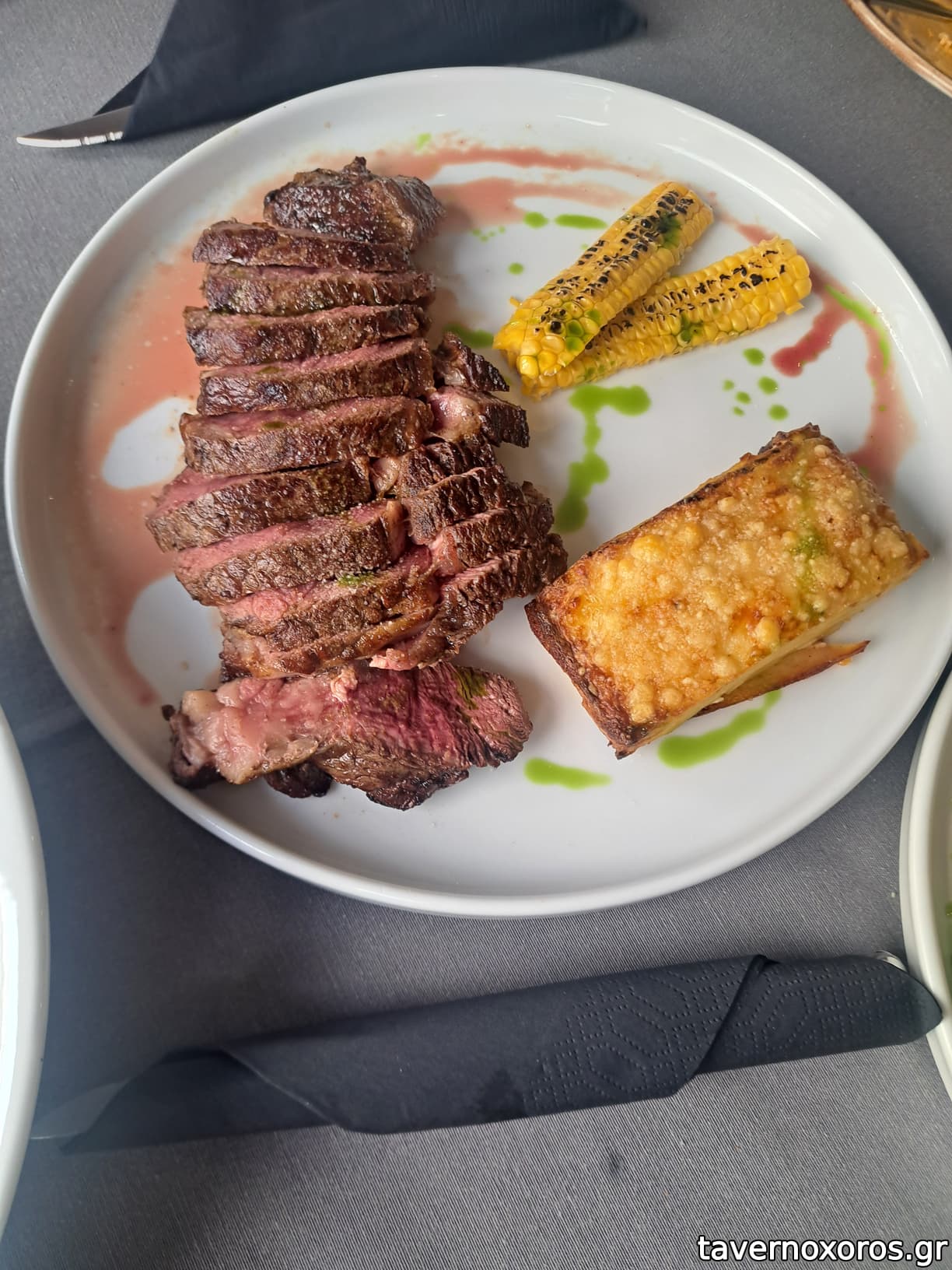 Κοπή ημέρας, rib eye Βραζιλίας - σωστό ψήσιμο αλλά αδιάφορο γευστικά κρέας. Ωραία τα συνοδευτικά.