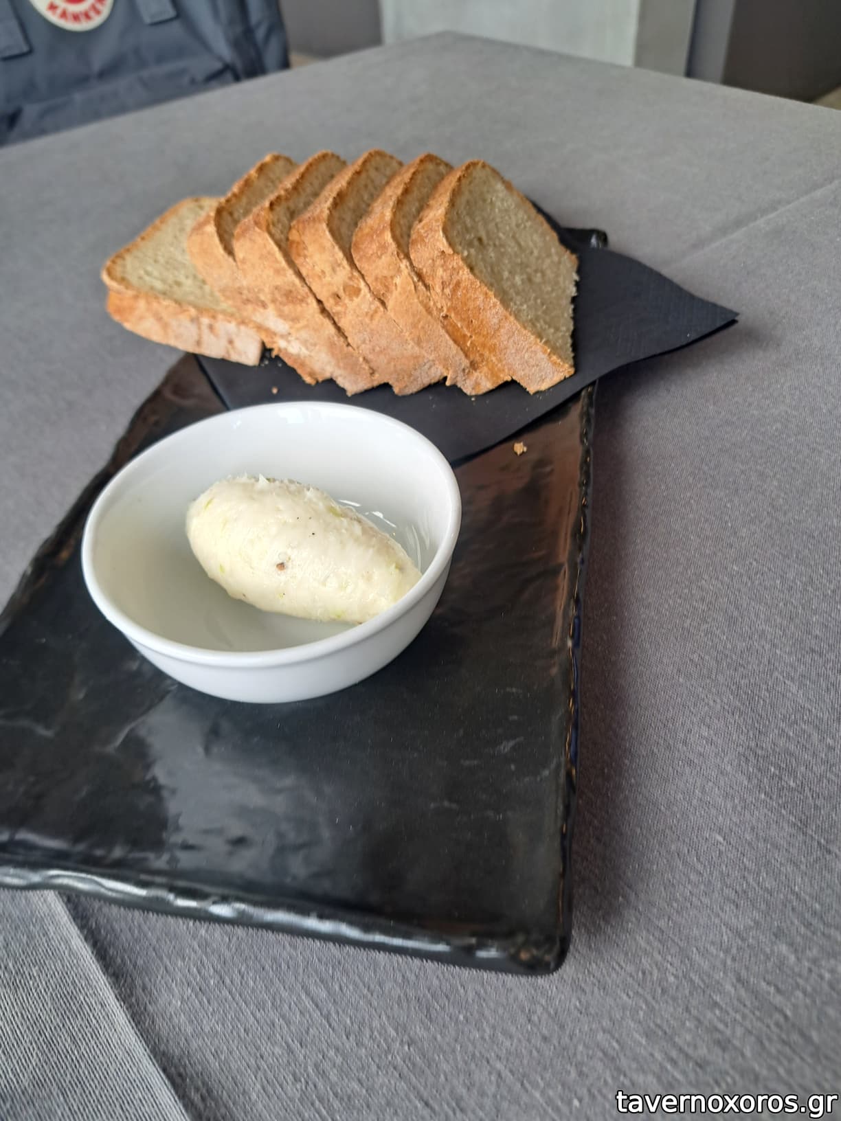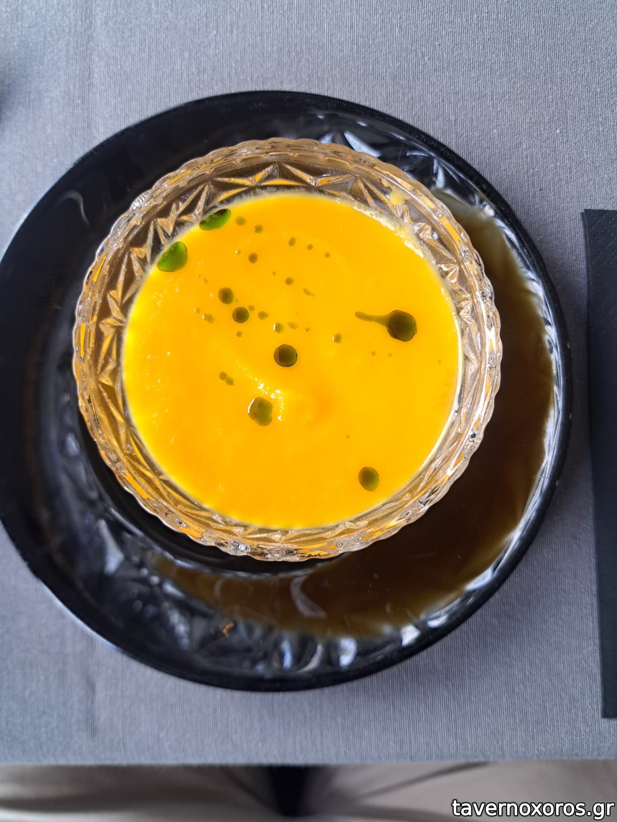 Καλωσόρισμα με σούπα λαχανικών βελουτέ και βούτυρο με ξύσμα λάιμ και αλατοπίπερο για το ψωμί.