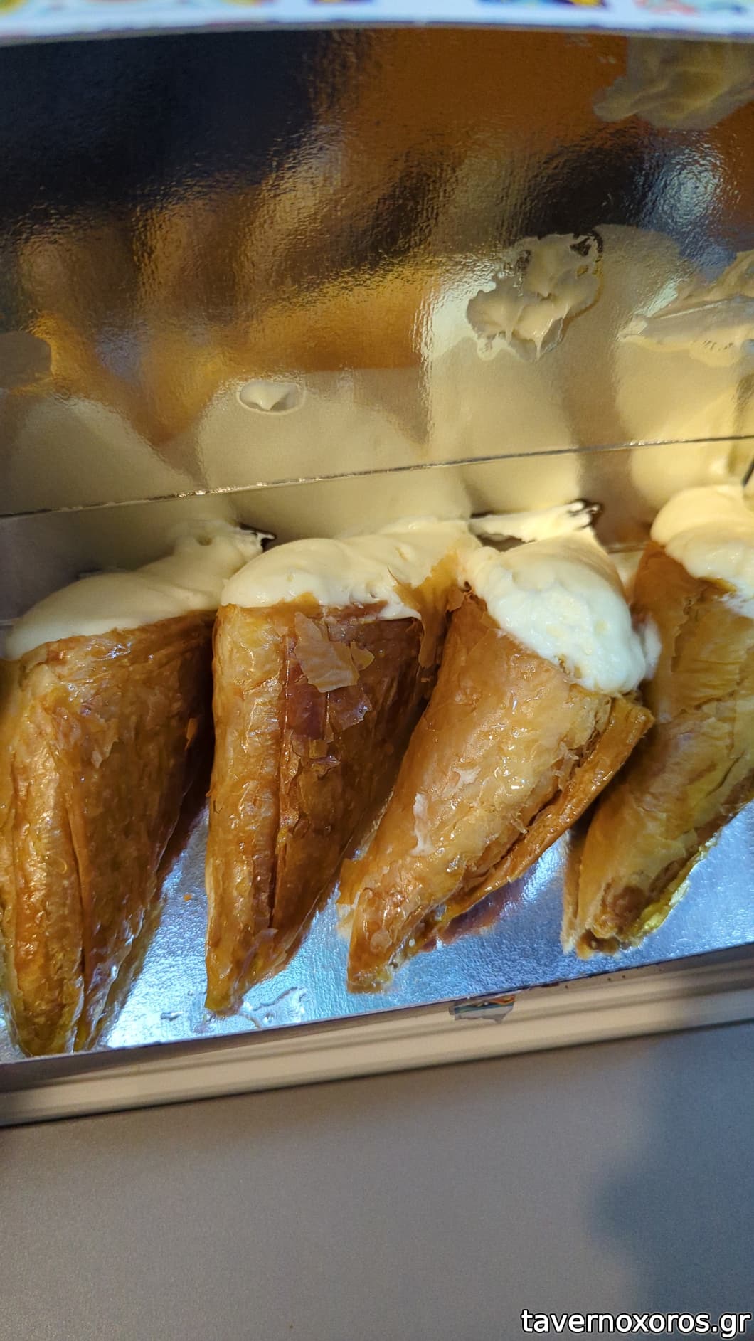 Τρίγωνα (ωραίο κρατσανιστό χοντρό σχετικά φύλλο, με έντονο το βούτυρο. Η κρέμα διαφορετική, πιο αεράτη, πιθανόν αναμεμειγμένη με σαντιγί.. δεν τρελάθηκα κιόλας)