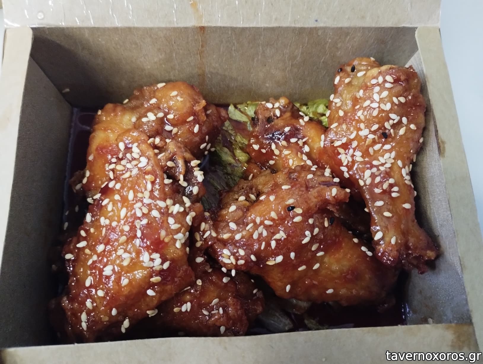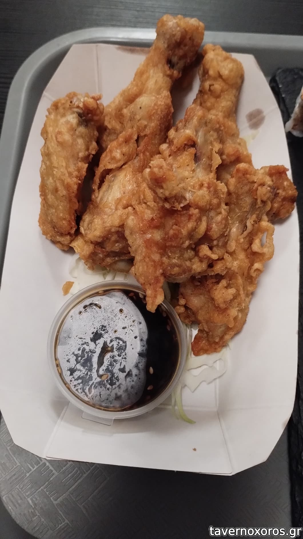 -μια μερίδα Φτερούγες κοτόπουλο με αυτοκρατορική σάλτσα. Η σάλτσα καλή, οι φτερούγες κλασικό απλό τηγανητό κοτόπουλο. Χορταστικό πιάτο.