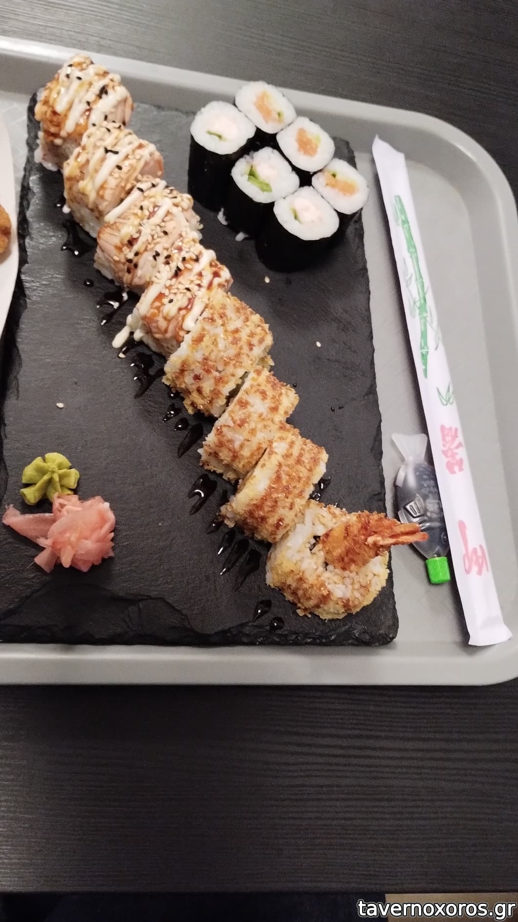 -ένα sushi combo 2: 2 είδη μάκι, απλά, σα νερόβραστα (πολύ sticky rice), και 2 ξεχωριστά είδη sushi, τα gold dragon & τα mermaid. Ok.