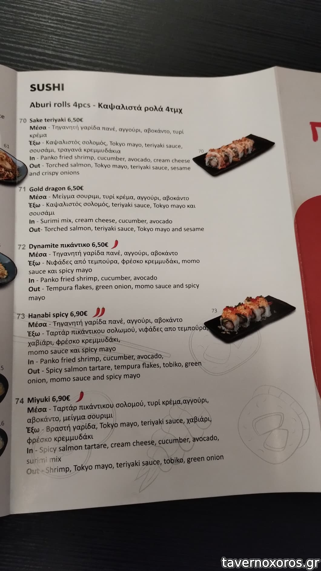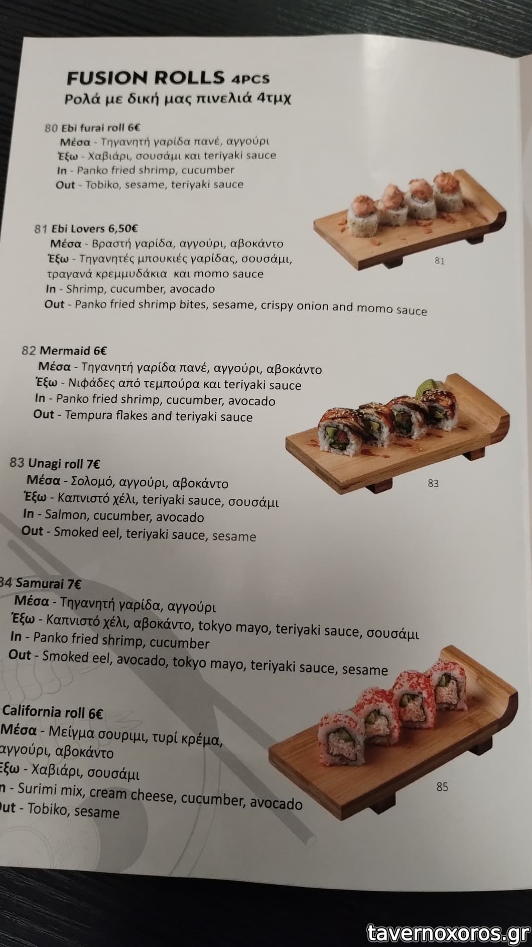 Όταν είχαν ανοίξει, είχαμε μιλήσει μαζί τους, ήταν δεκτικοί, πρόσχαροι, έψαχναν τα πατήματά τους για το πώς θα πάει το πράμα. Τώρα το μαγαζί πάει τρένο, οι ντελιβεράδες των εταιρείων πηγαινοέρχονται στην είσοδο. Έχει γίνει ένα κλασικό συνοικιακό σουσάδικο, και μάλιστα με σηκωμένες τιμές. Το μενού εντελώς κλασικό, χωρίς πολλές ξεχωριστές επιλογές που θα με ενδιέφεραν εμένα.