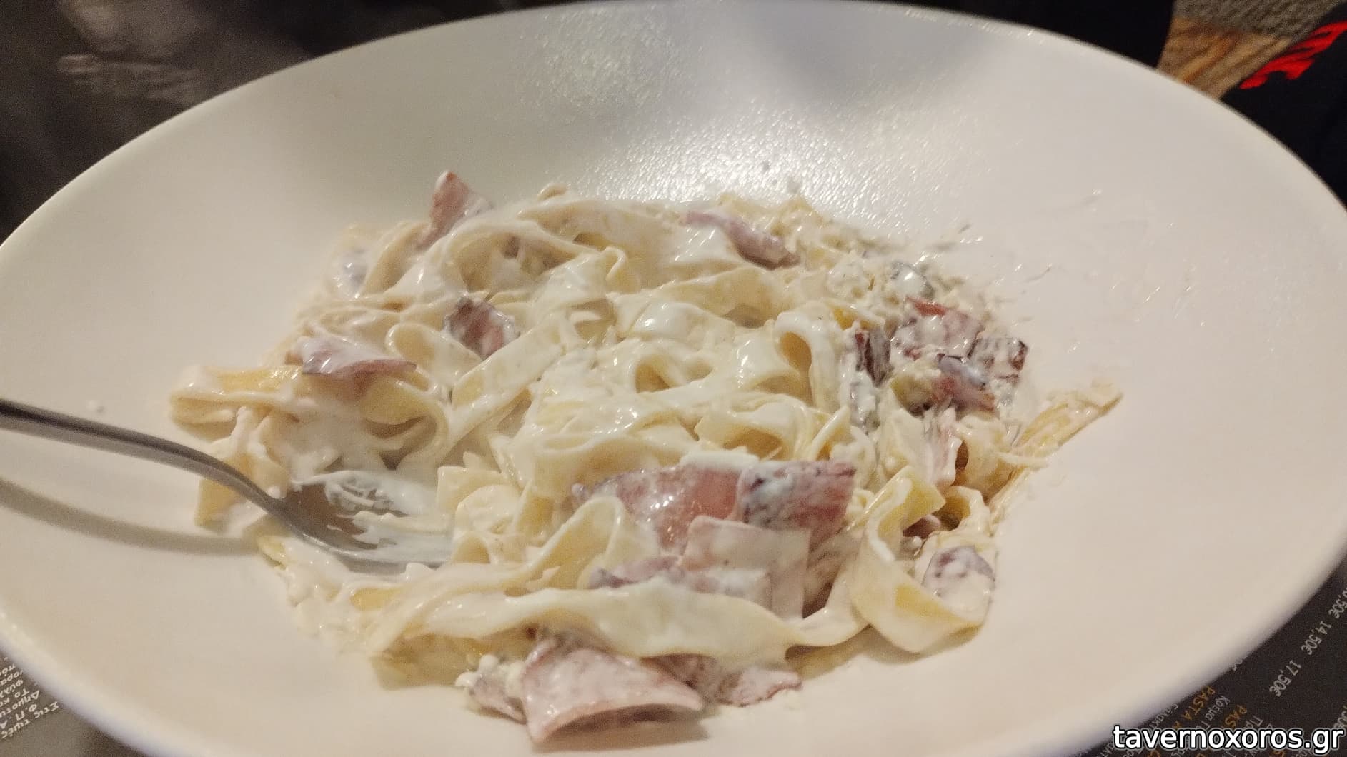 Φρέσκες ταλιατέλες carbonara με κρέμα γάλακτος (κλασική ελληνική εμπορική καρμπονάρα. Αδιάφορη)
