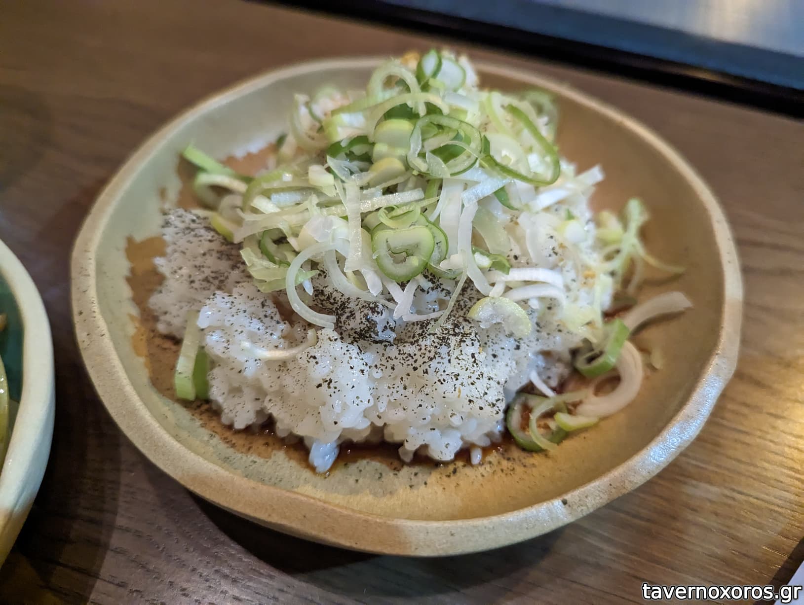 "Ρύζι αχνιστό με κρεμμυδάκι φρέσκο, nori, soy και παστό κρόκο" (οκ, ίσως αξίζει σαν προσθήκη για να χορτάσεις)