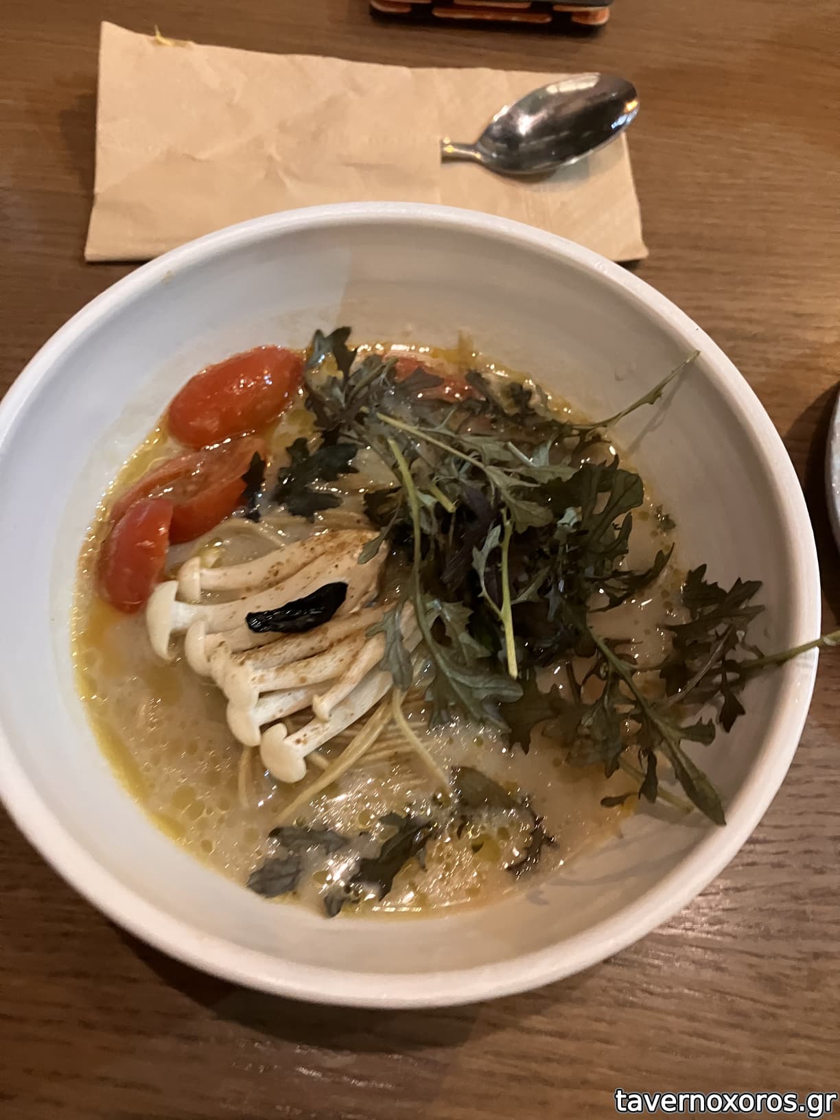 Ράμεν με noodles σίκαλης και χοιρινή πανσέτα: Επίσης πάρα πολύ καλό, ζωμός με πολύ δυνατή γεύση και η πανσέτα κοβόταν με το κουτάλι.