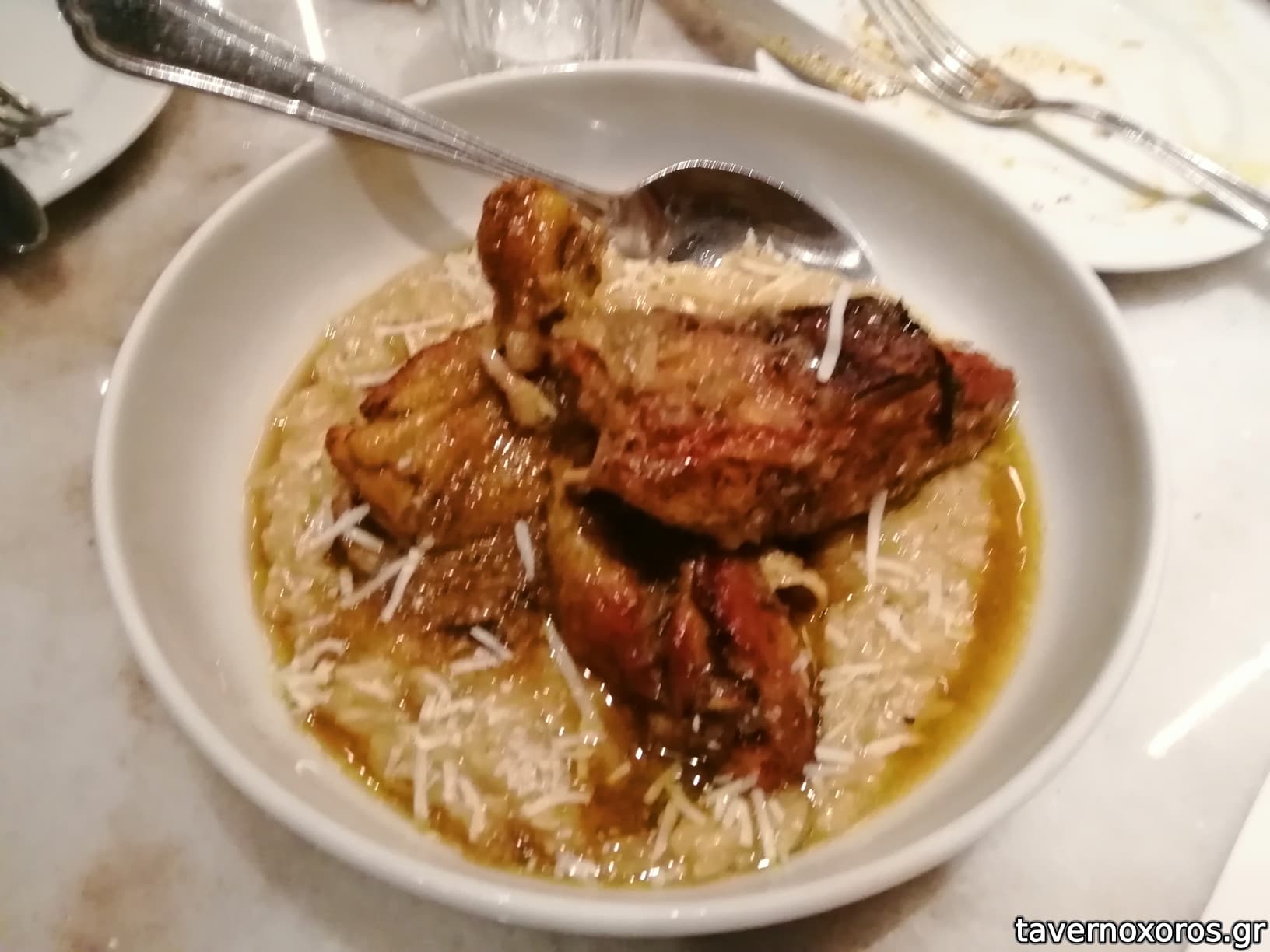 - Πετεινός κρασάτος με τραχανά: Το πιάτο που προσωπικά μου άρεσε περισσότερο. Ο τραχανάς εξαιρετικός και όσο του πρέπει κόκκινος. Ο κόκκορας --κομμάτι με τα όλα του-- πολύ καλά μαγειρεμένος και σε γενικές γραμμές μαλακός. Γλείψαμε μέχρι τελευταίο κοκκαλάκι και πραγματικά δεν γινόταν αλλιώς.