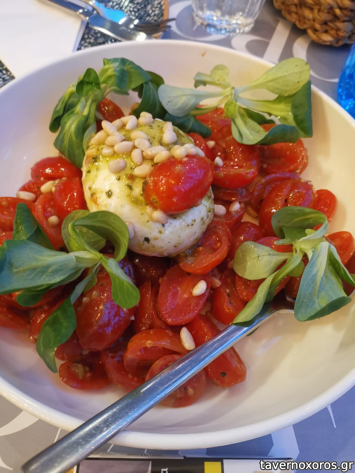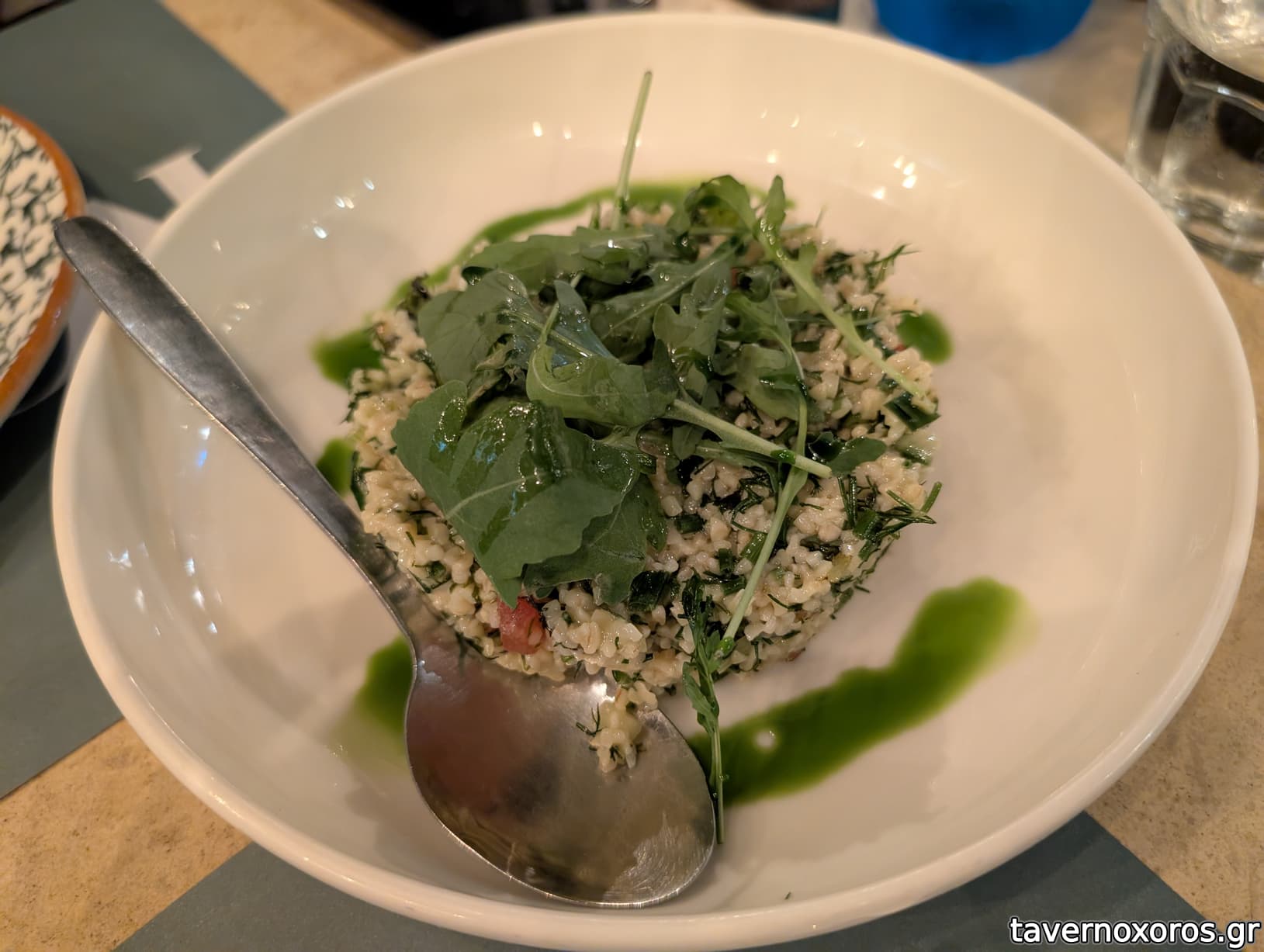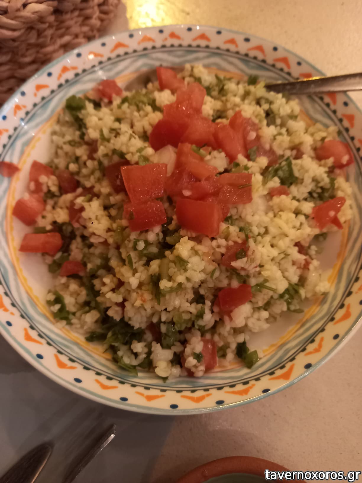 "Ταμπουλέ: πληγούρι, ντομάτα, αγγούρι καρέ, ρόκα, μυρωδικά, λαδολέμονο" (πολύ καλό)