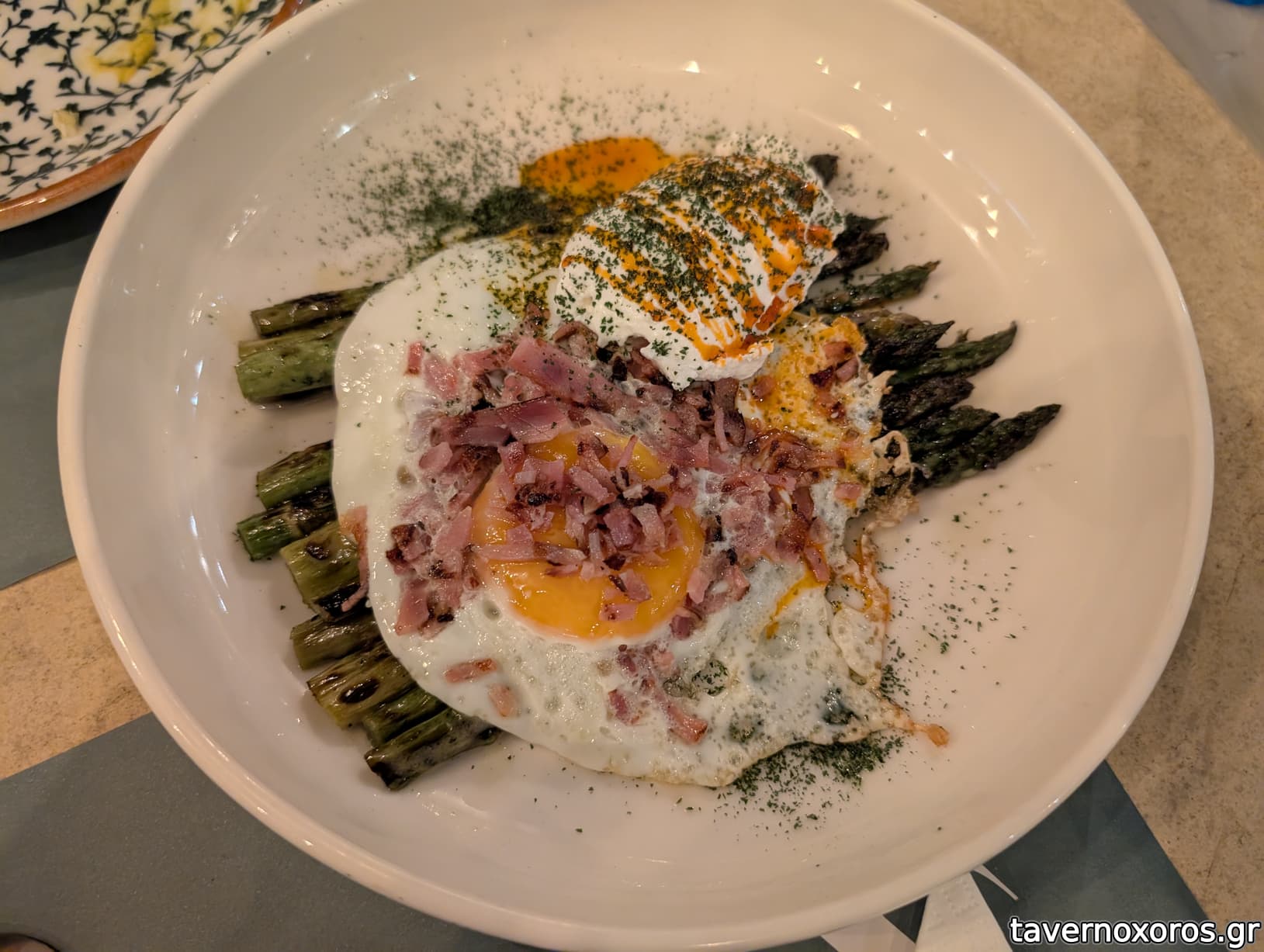 "Σπαράγγια στη σχάρα, αυγό μάτι, τσαλαφούτι, τραγανό μπέικον" (μια χαρά)
