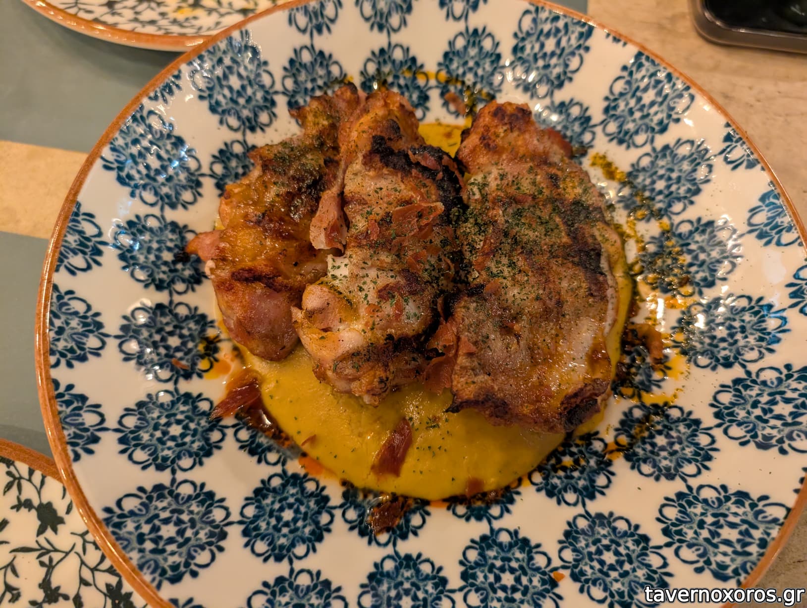 "Κοτόπουλο μπούτι σχάρας, κρέμα καλαμπόκι, τσιπς προσούτο" (μια χαρά)