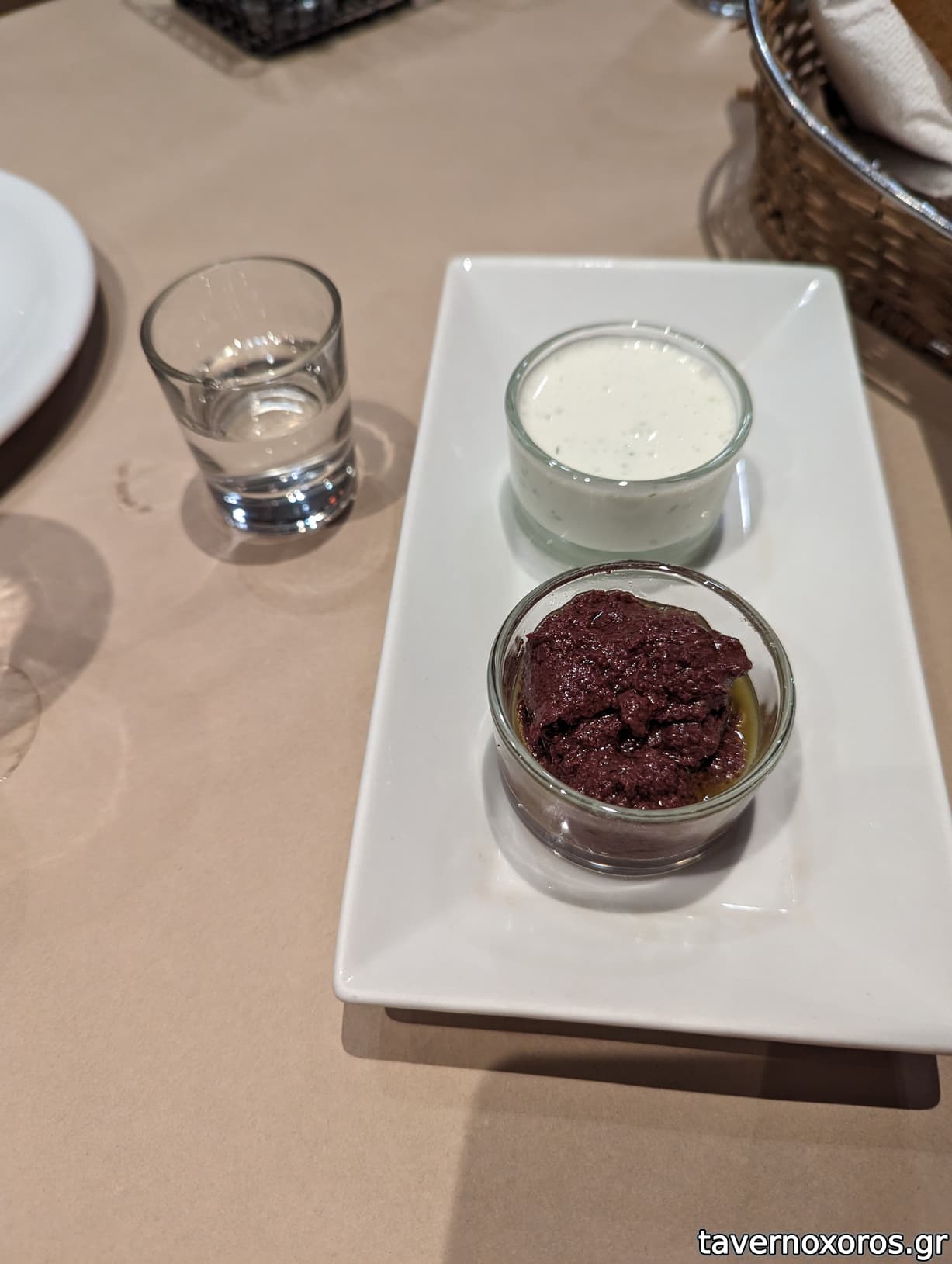 Μαζί με το ψωμί έφεραν πάστα ελιάς με μια ακόμη σος γιαουρτιού και από ένα σφινάκι ρακί.