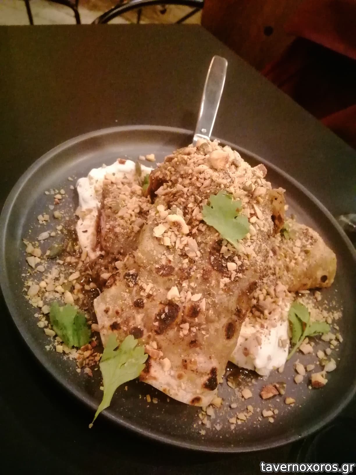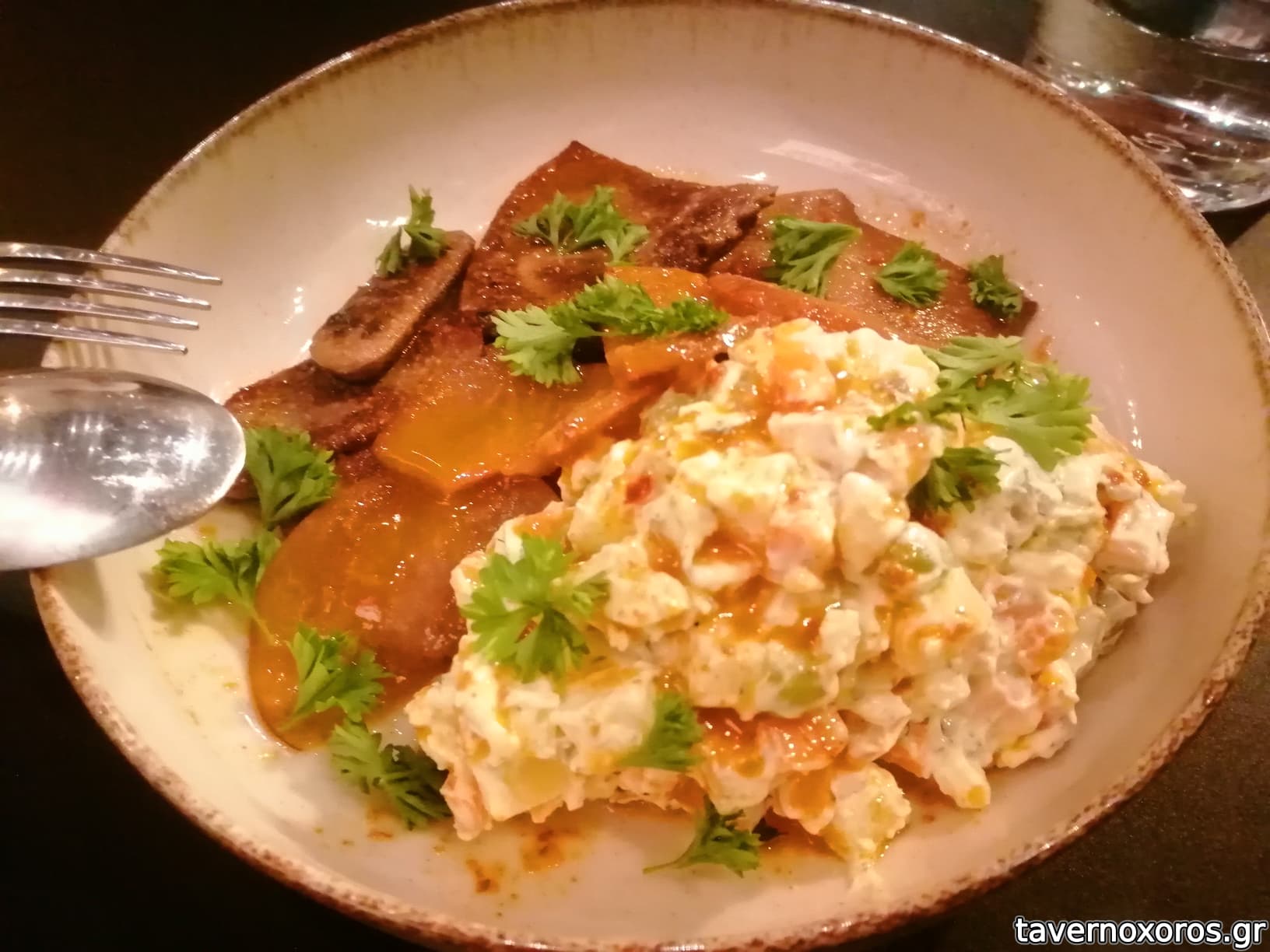 "Κρούντο γαρίδας, σαλάτα κυδώνι, οινολάσπες" (πολύ καλό)