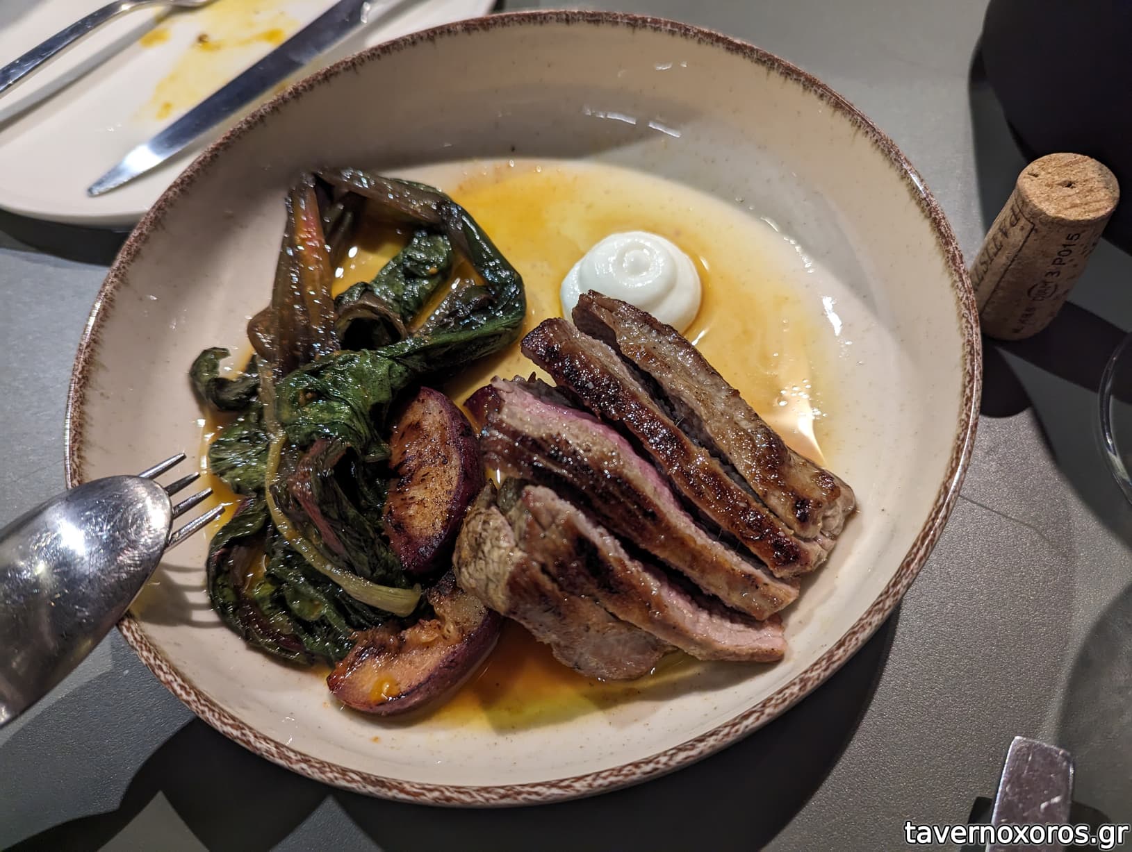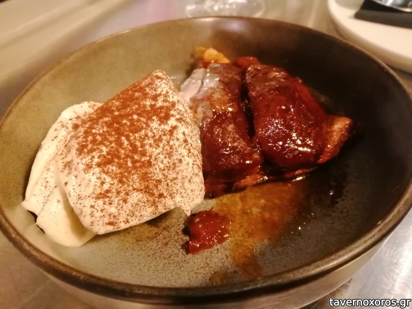 "Διάφραγμα μόσχου, σέσκουλα, κορόμηλα τουμ" (μέτριο, παραψήθηκε για τα γούστα μου, μικρή ποσότητα για να αξίζει τα 16€)