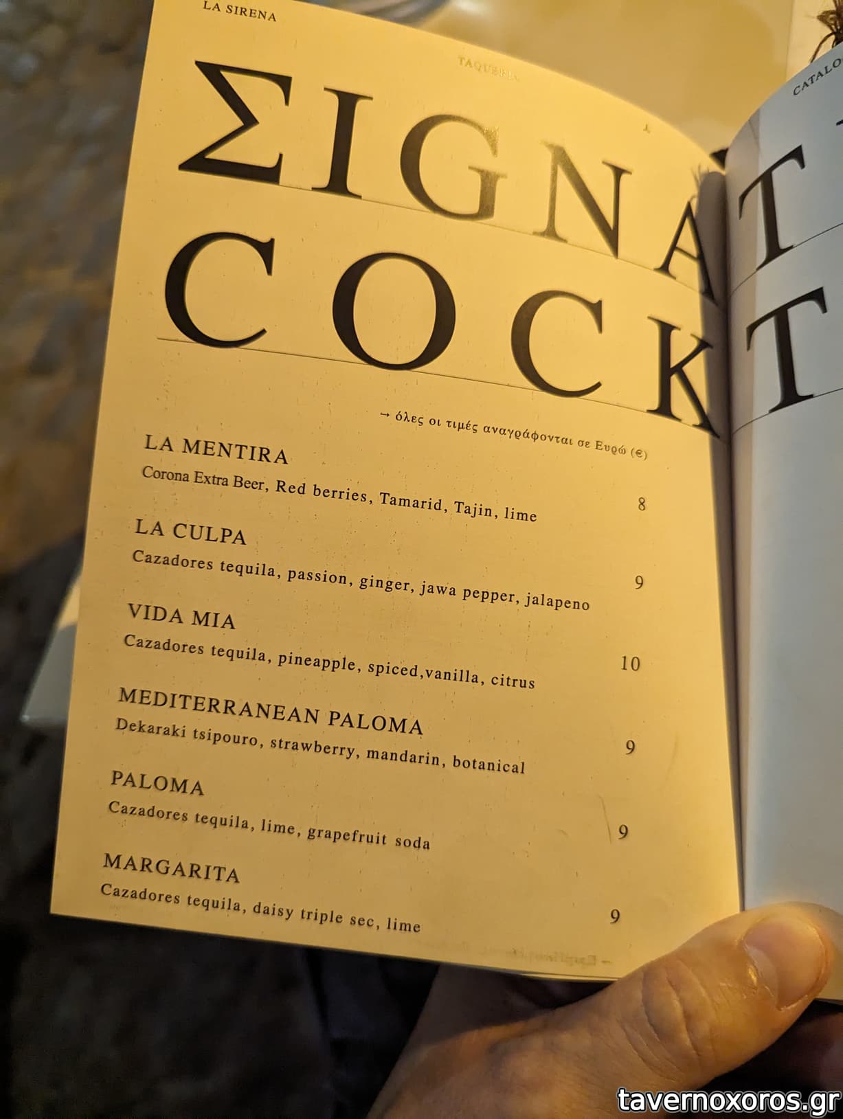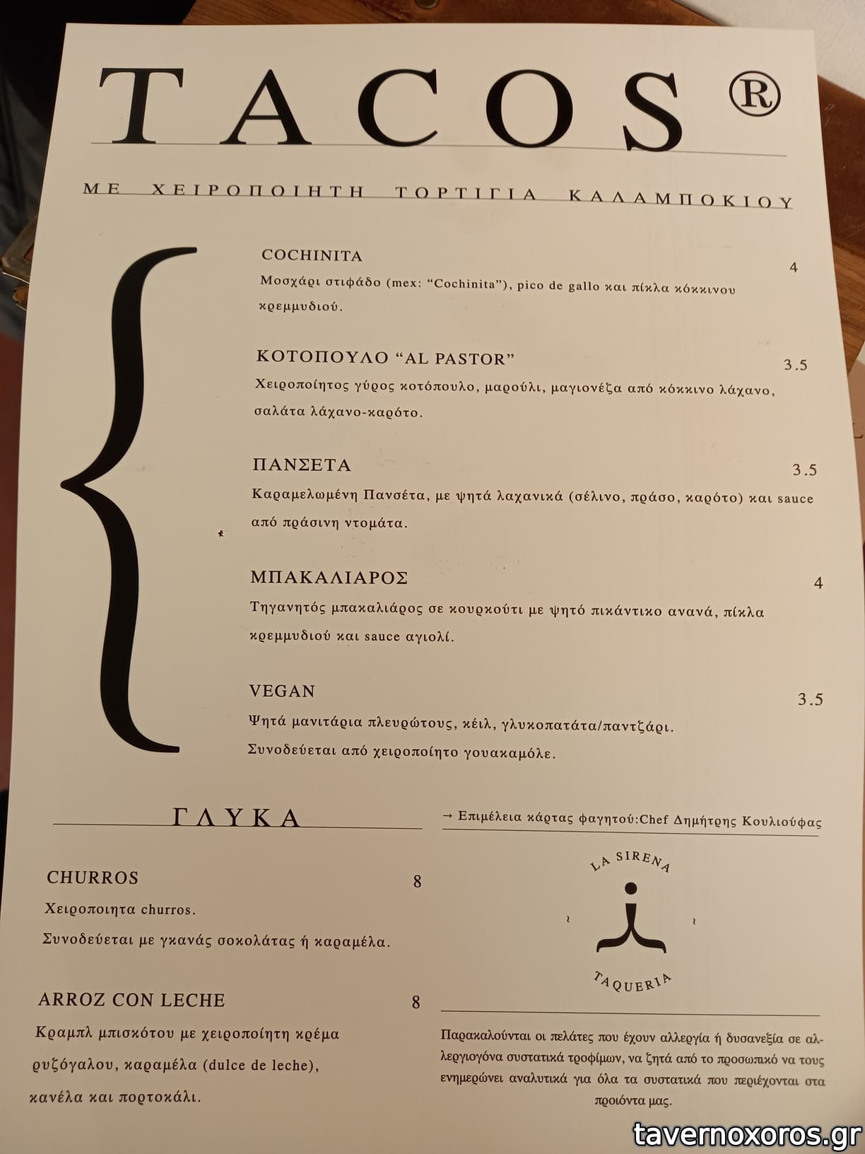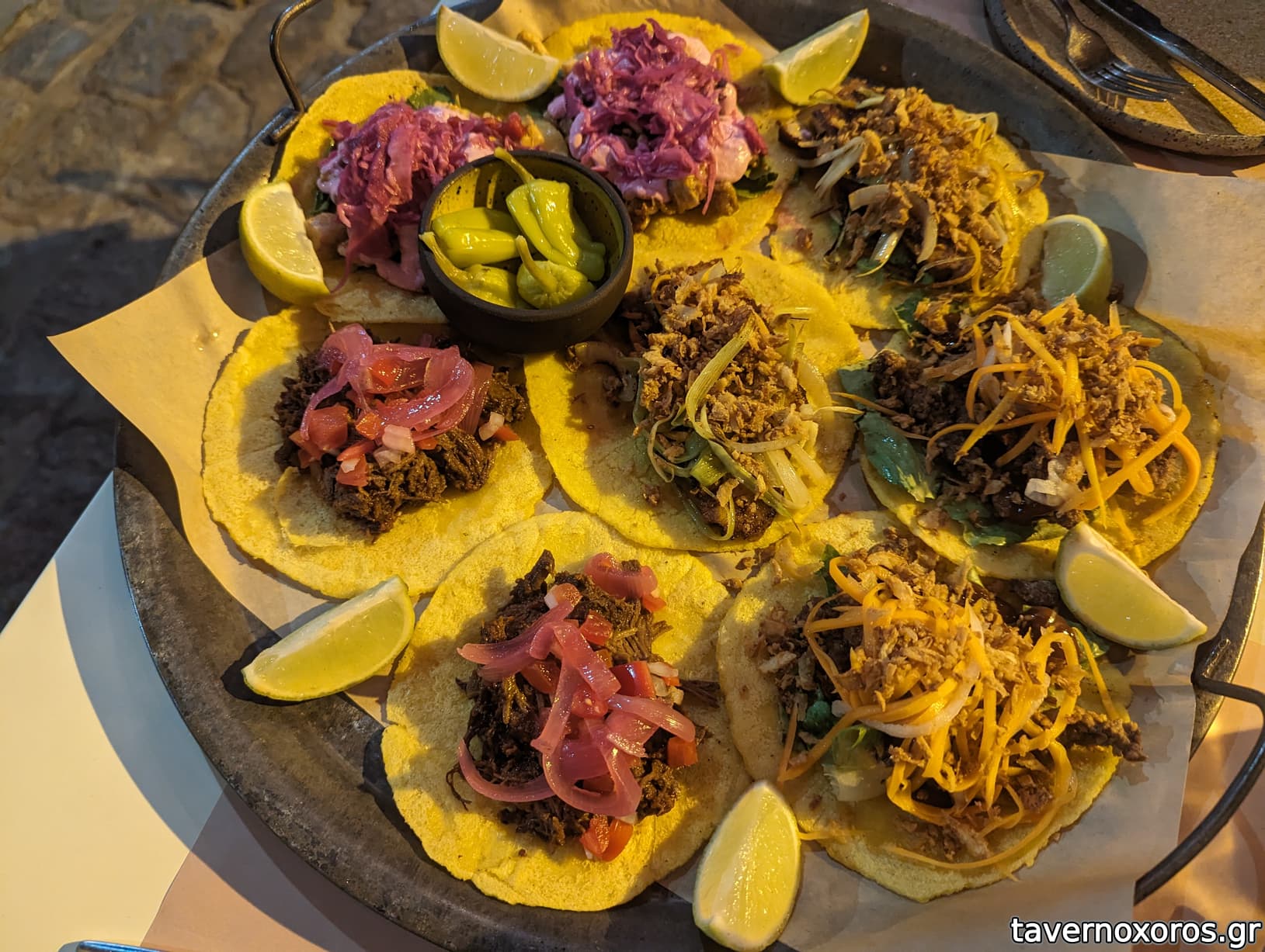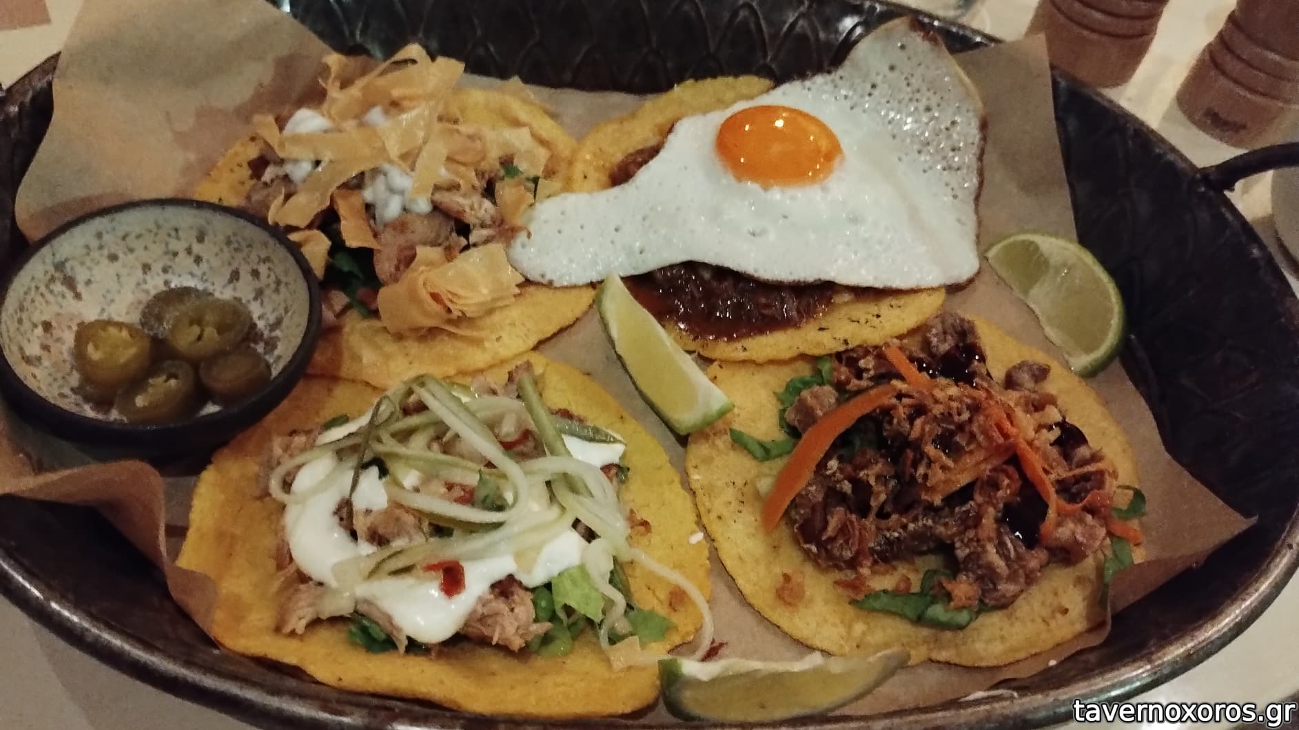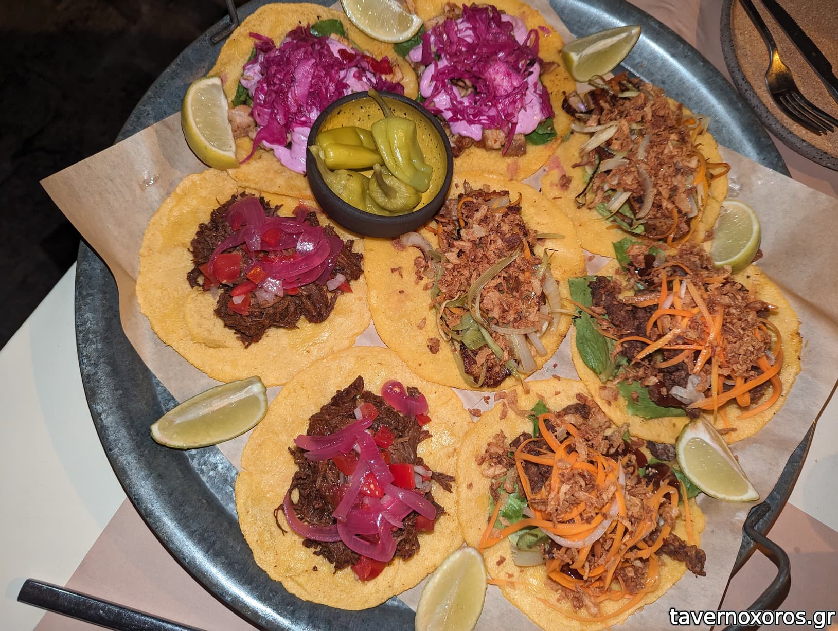 Tacos: κοτόπουλο al pastor (πολύ μέτριο, ένιωθες ότι ήταν ξαναζεσταμένο κοτόπουλο στην πλάκα, όχι σε γυριέρα) & πανσέτα (οκ) & milwaukee (πολύ καλό!) & cochinita (δεν τρελάθηκα)