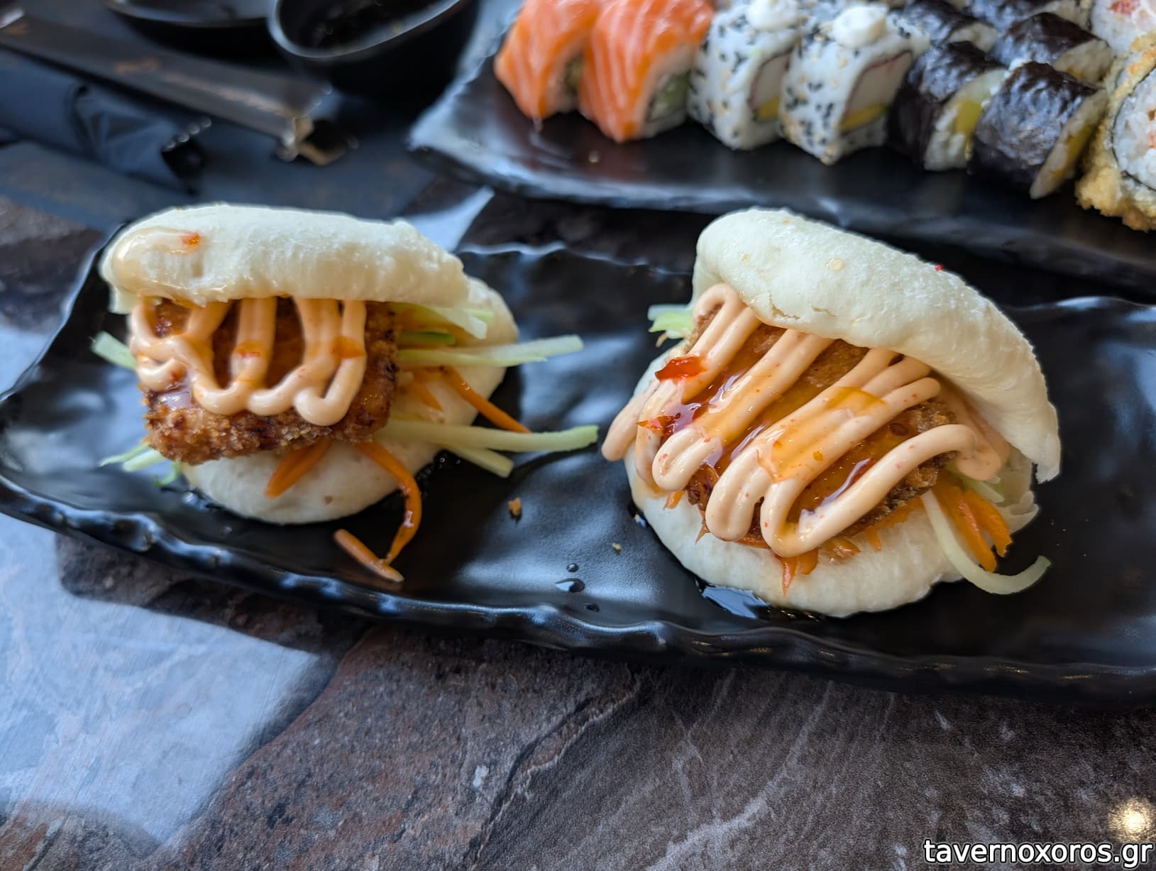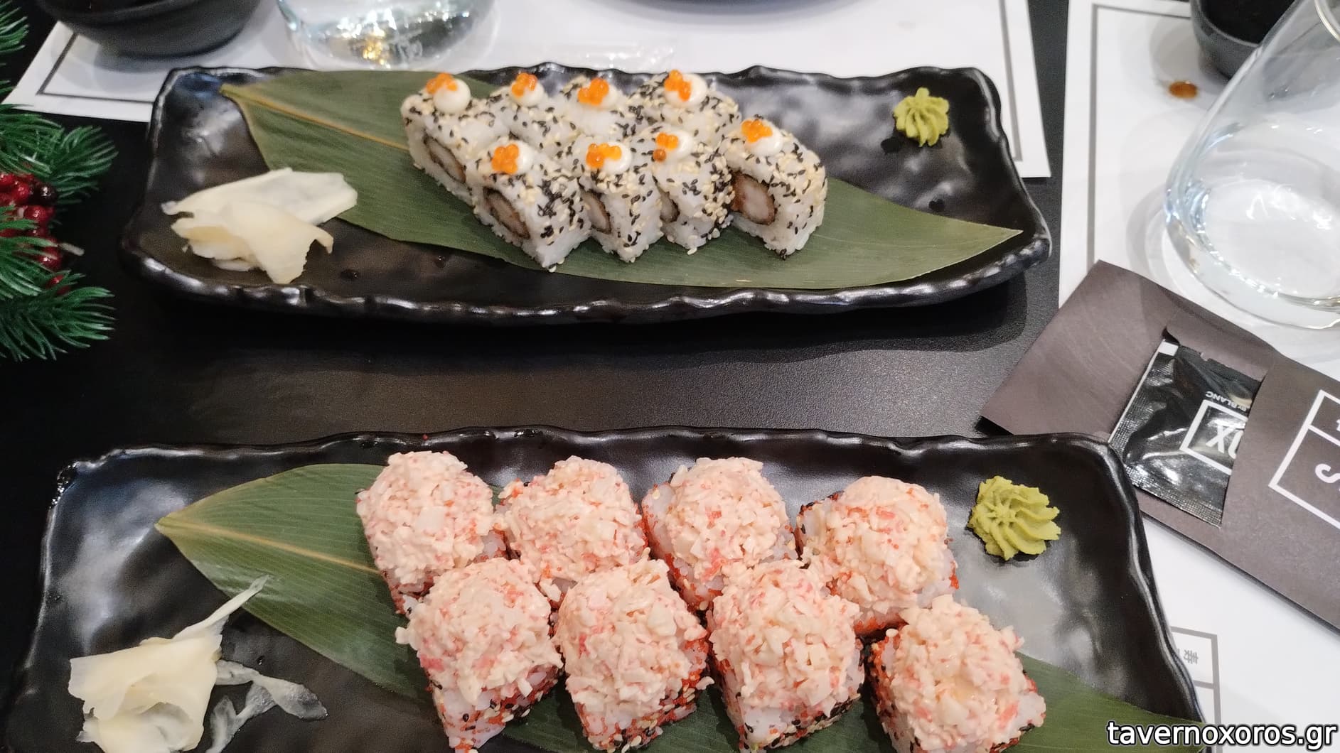 Κοντά spicy crab. Πέρα ebi tempura. Μού άρεσε πιο πολύ η τεμπούρα, και επειδή ήταν ζεστή, ενώ το spicy crab παγωμένο