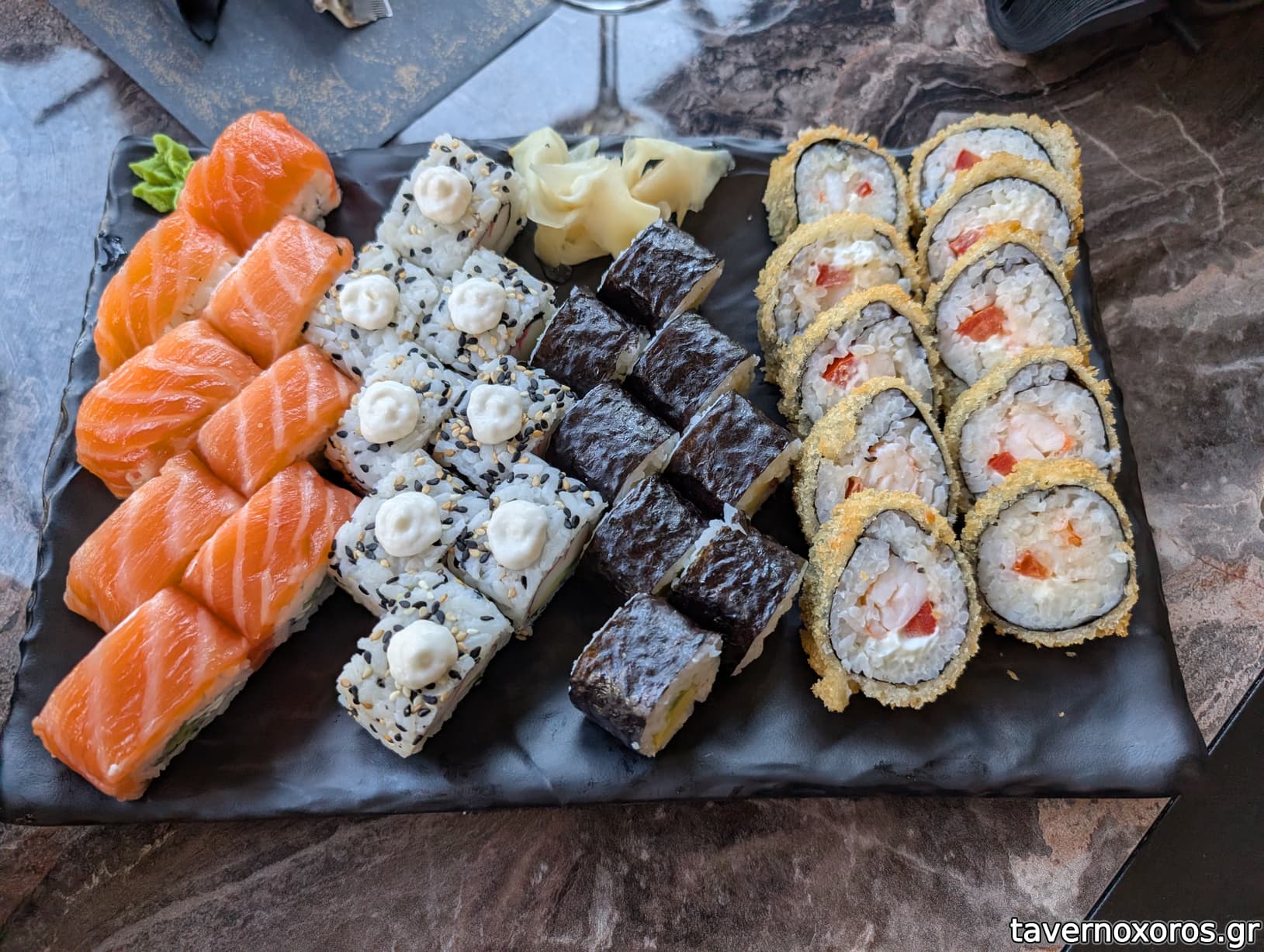 Sushi set 2: philadelphia roll (καλό), california roll (αδιάφορο με σουρίμι), crunchy shrimp roll (βαρύ το τηγανητό), avocado maki roll (χωρίς ψάρι, αδιάφορο)