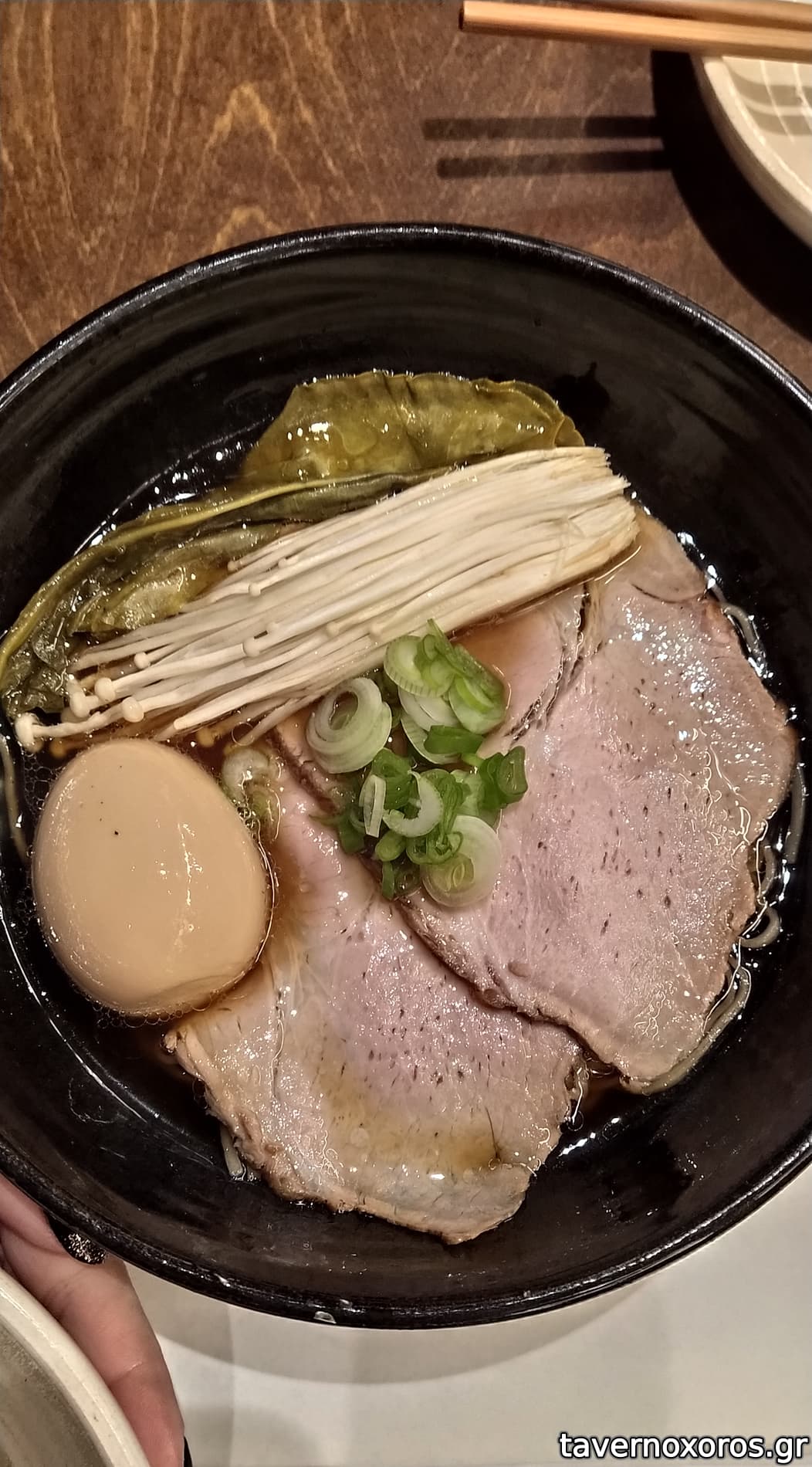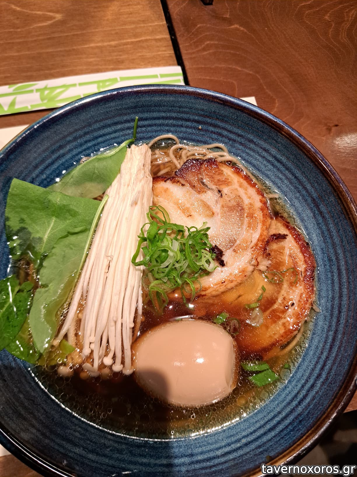 Shoyu Ramen με λάπαθο, χοιρινό chasu, enoki mushrooms και αυγό (ωραίο)