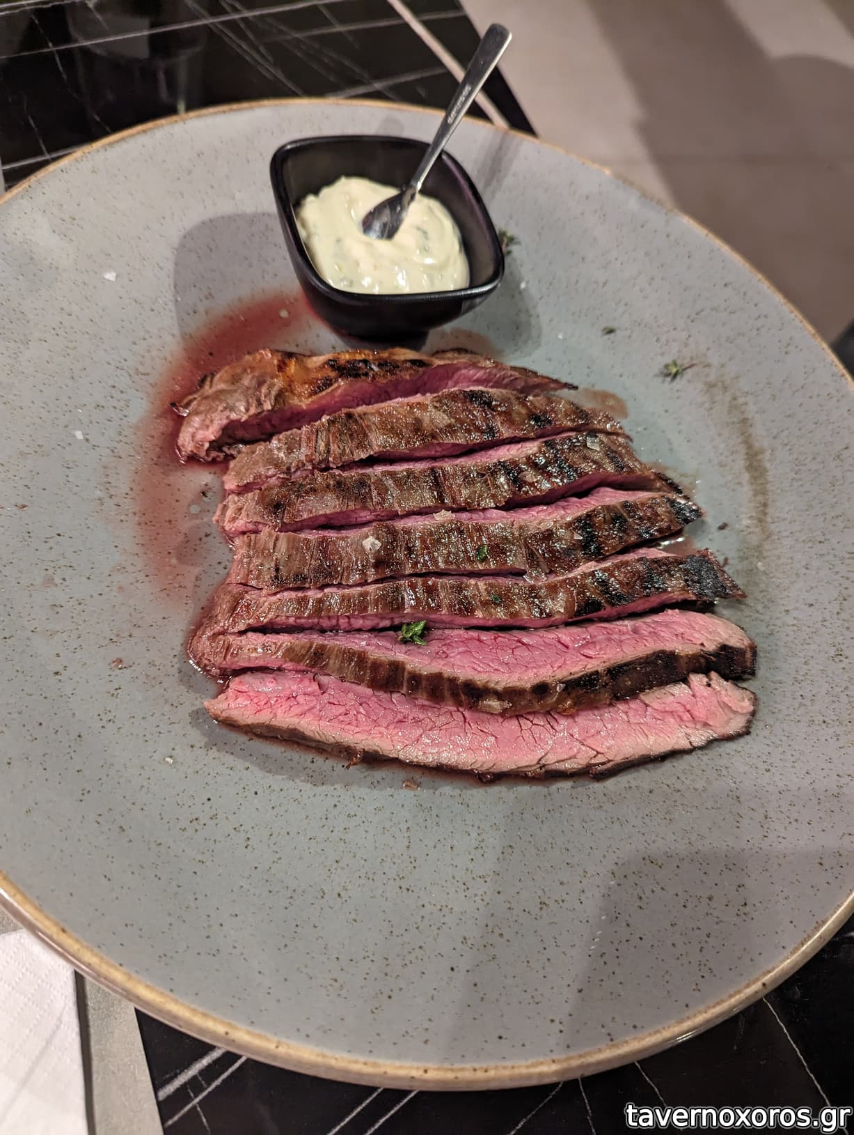 Flank steak λάπα (κάτι δεν πήγε καλά στο ψήσιμο και δεν την ευχαριστηθήκαμε) με σάλτσα pepper (μέτρια)