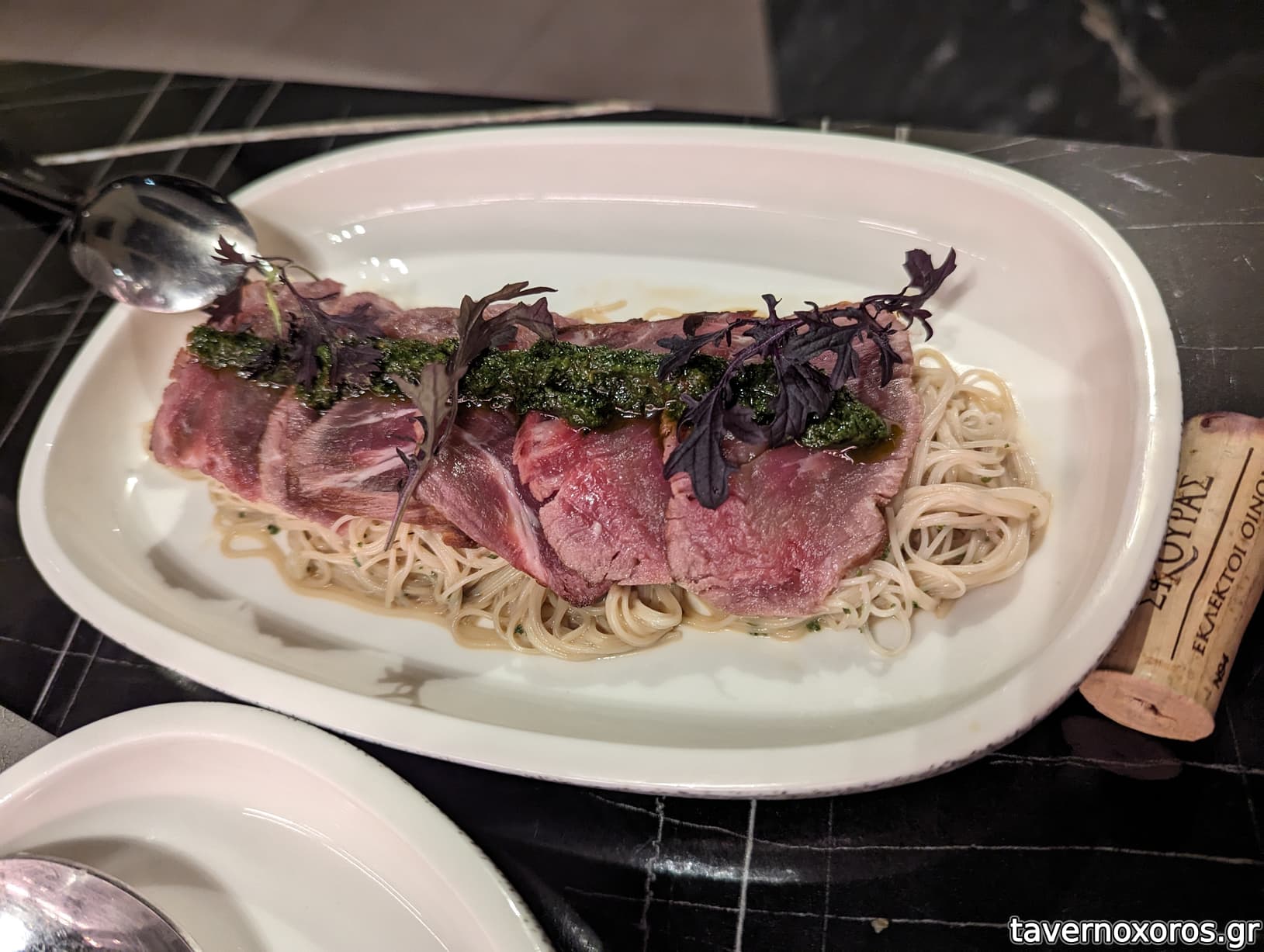 "Tataki μόσχου chimichurri, vermicelli, σάλτσα ponzu, spicy mayo" (σερβίρεται κρύο, επομένως δεν έχει κανένα νόημα που είναι tataki το μοσχάρι, καλύτερα ωμό, αλλιώς συμπαθητικό, στα 16€)