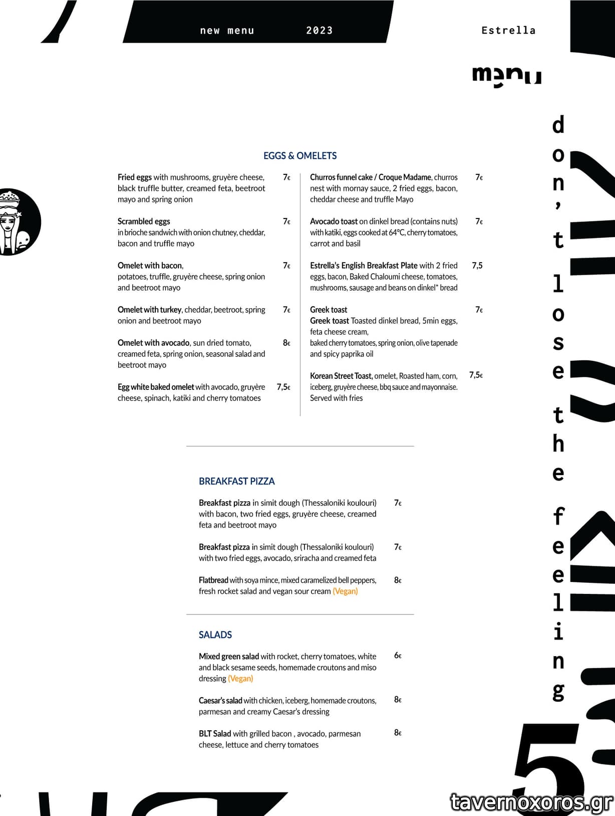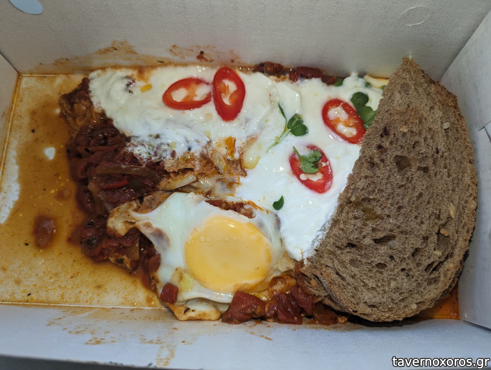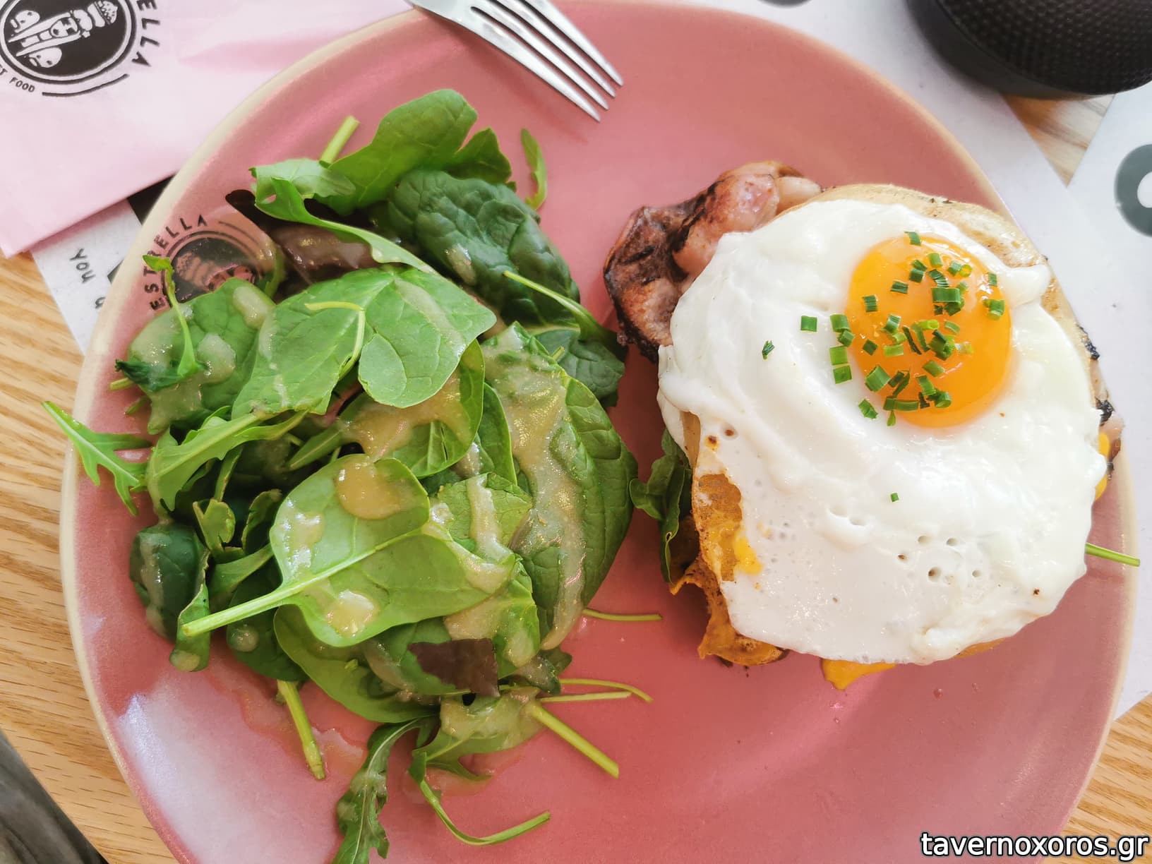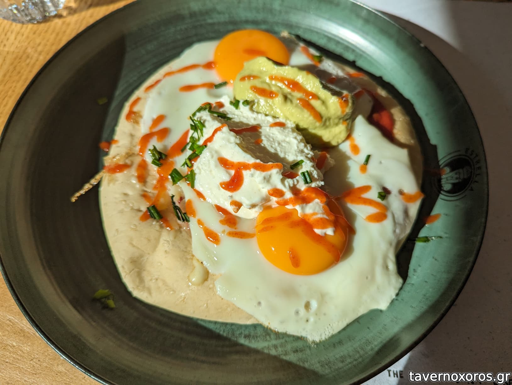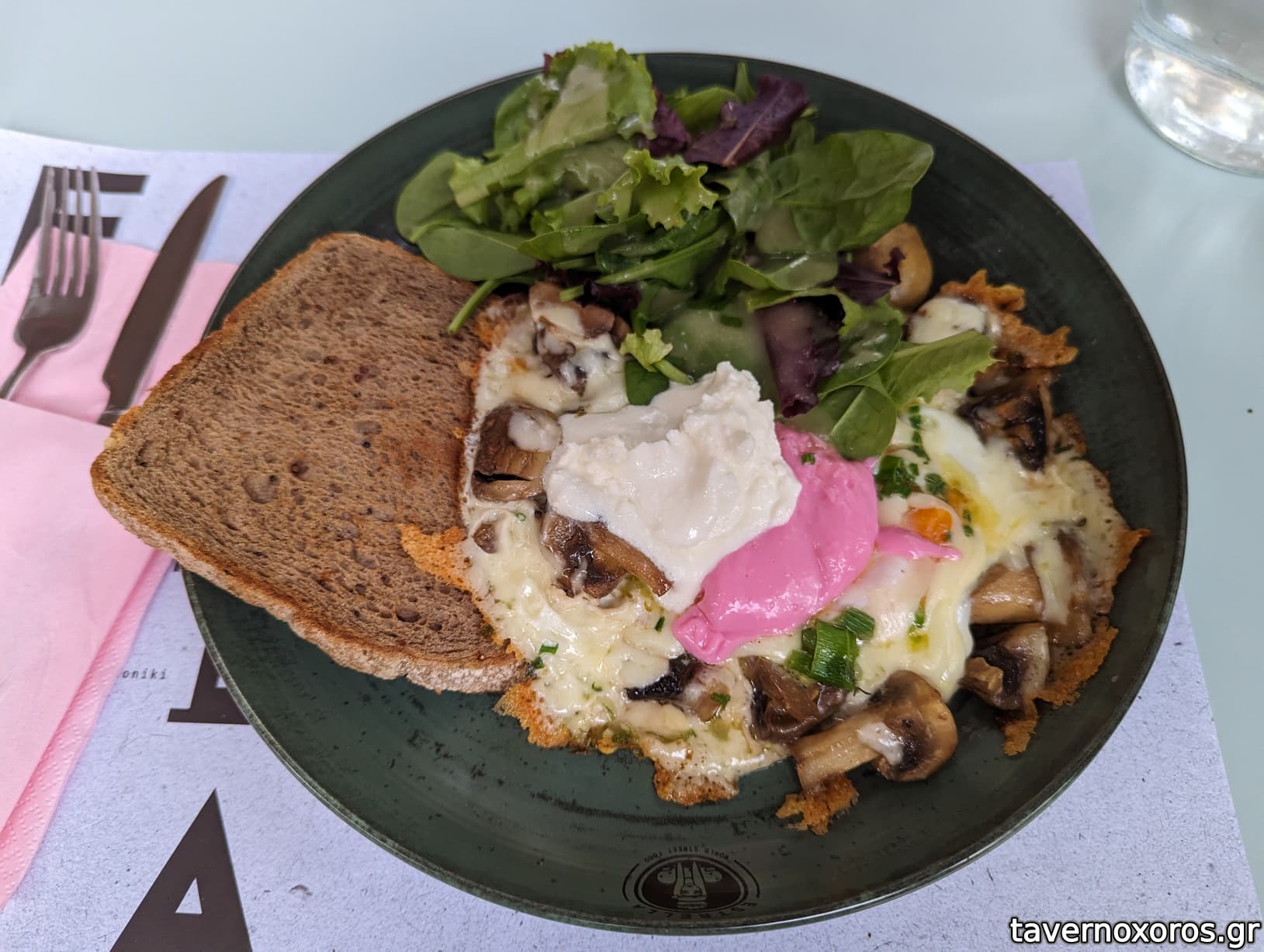 "Αβγά μάτια με μανιτάρια, γραβιέρα, βούτυρο μαύρης τρούφας, κρέμα φέτας, φρέσκο κρεμμύδι και σπιτική μαγιονέζα πάνω σε ψωμί" (μια χαρά)