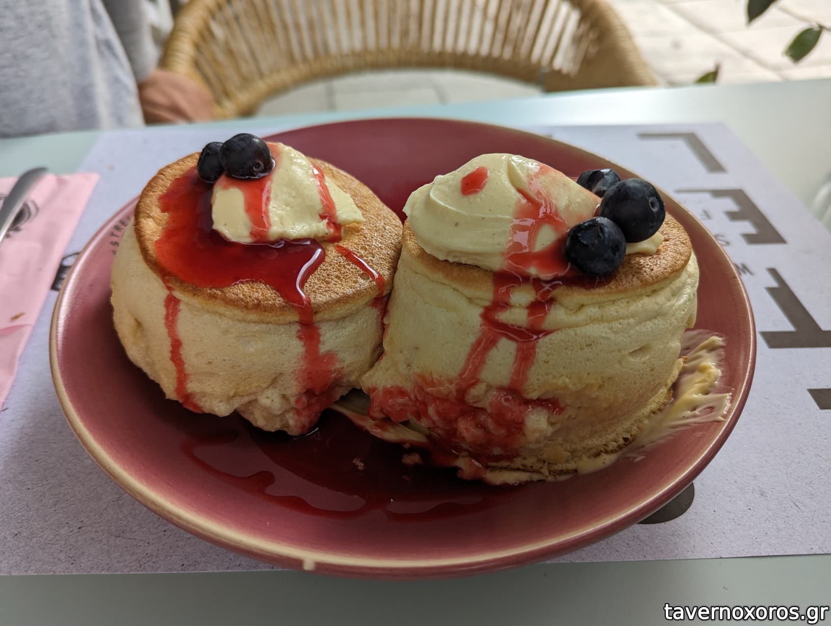 "Japanese suffle pancakes με κρέμα anglaise βανίλιας, coullis φράουλας και βατόμουρα" (μια χαρά)