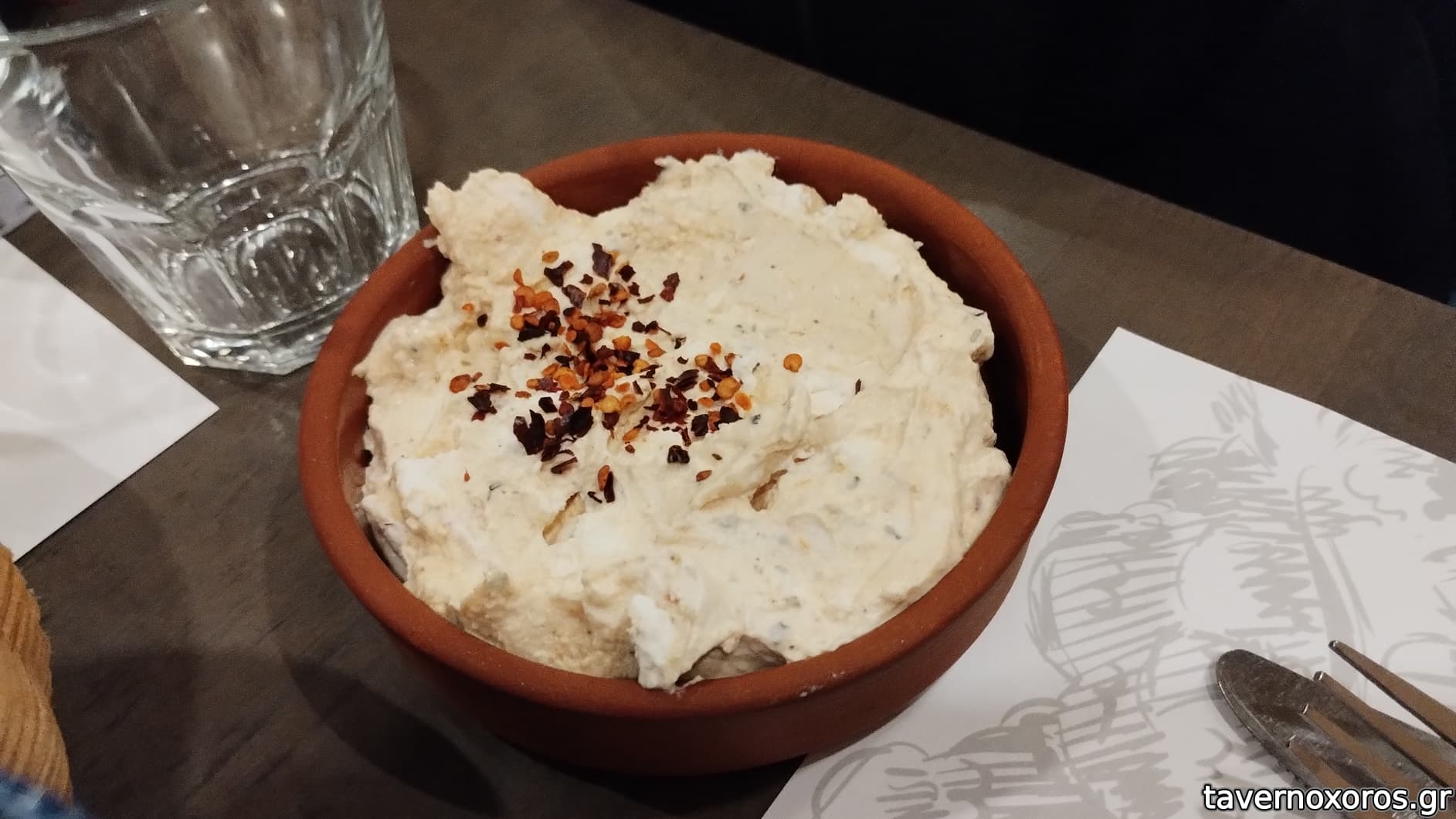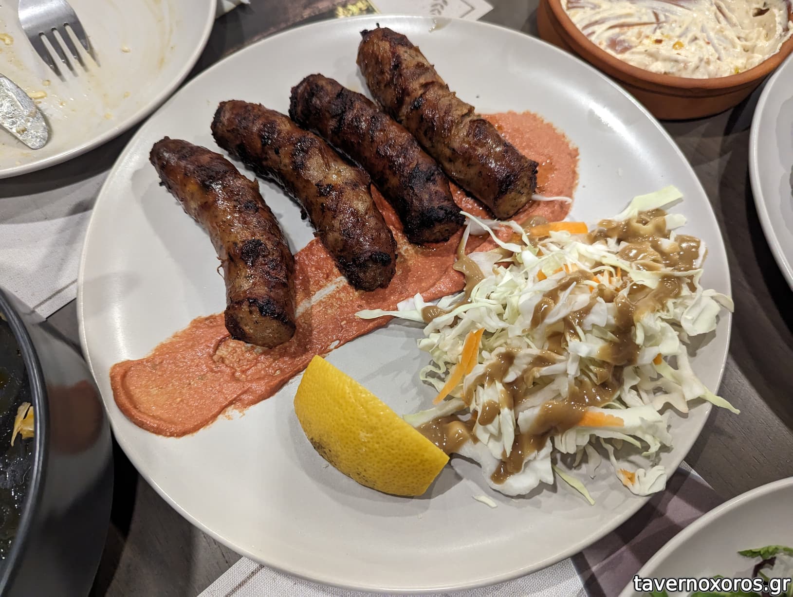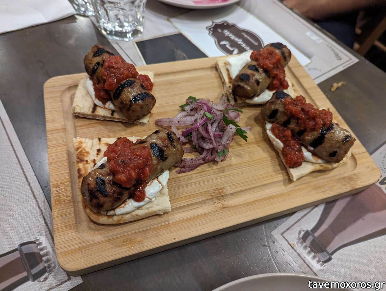 Φασόλια γίγαντες με λουκάνικο (ωραίος και χορταστικός μεζές), μισό τζατζίκι, μισή χτυπητή (χειροποίητα, συμπαθητικά)