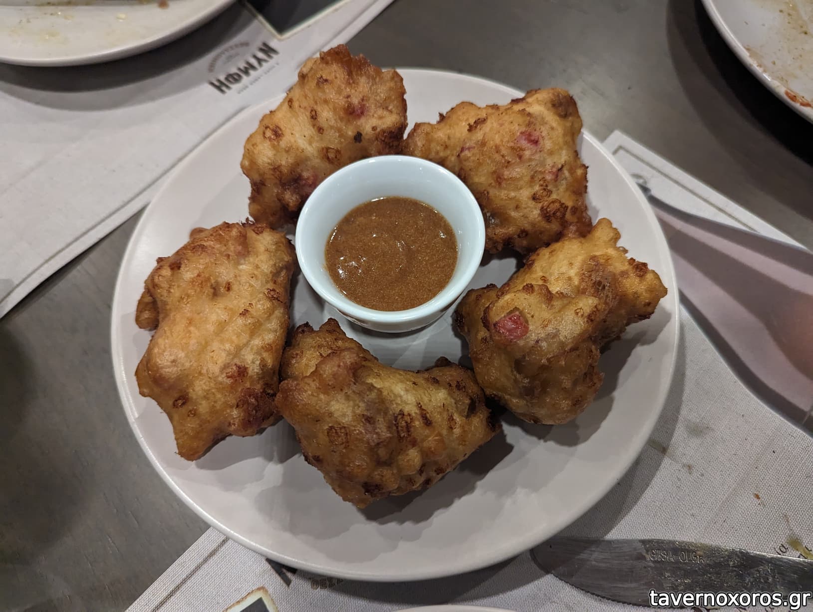 "Αλμυροί λουκουμάδες με καραμελωμένο κρεμμύδι, καπνιστή πανσέτα, γραβιέρα και χειροποίητη σως BBQ" (δε μου άρεσε)