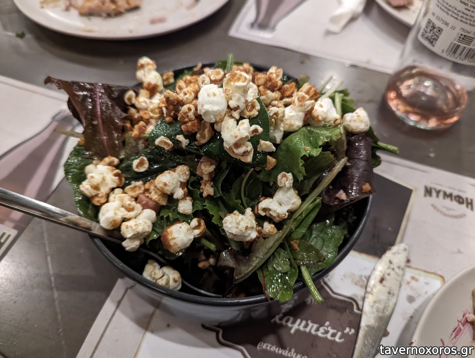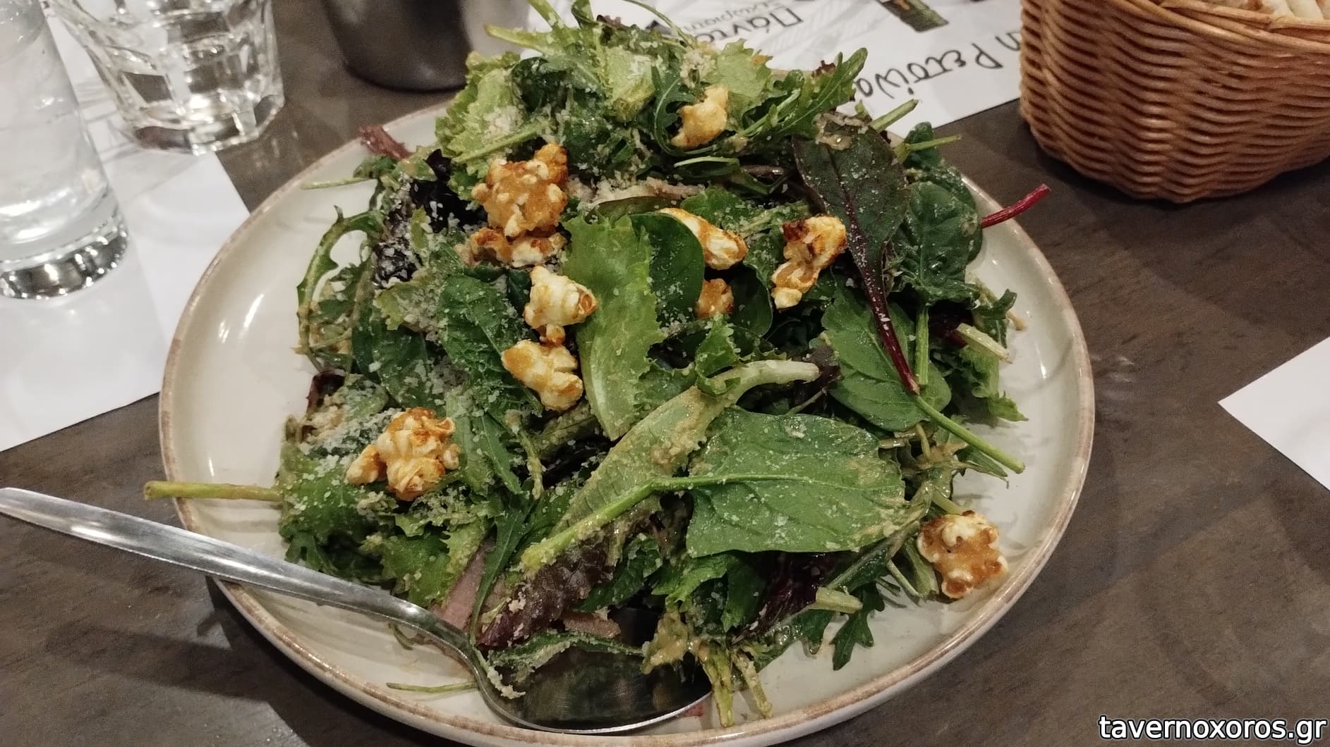 Σαλάτα μουχαμπέτι με πρασινάδα, βαλσάμικο και καραμελωμένα ποπ κορν! (ενδιαφέρουσα εκτέλεση, αλλά δεν την φάγαμε όλη)