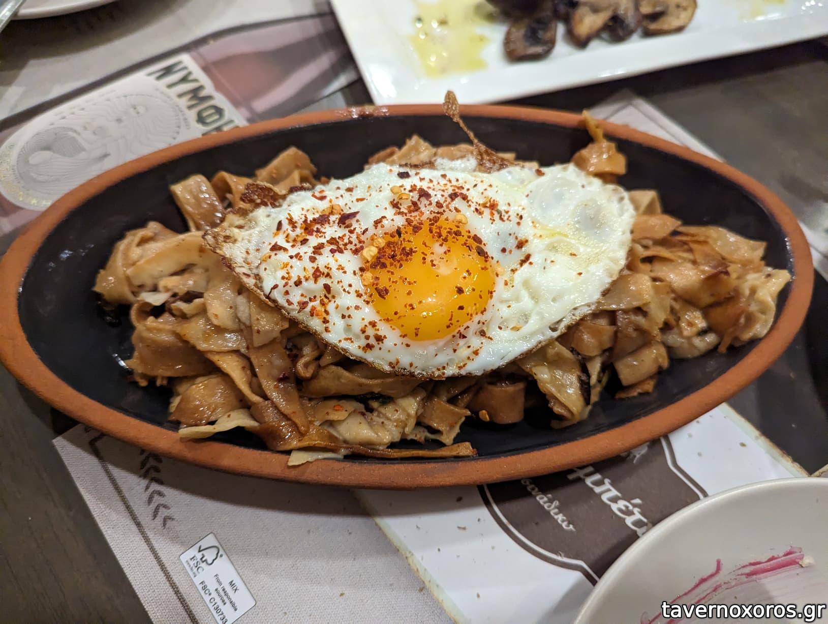 "Υβριστόν με φρέσκο βούτυρο, σκόρδο, φρέσκο κρεμμυδάκι και αυγό μάτι" (οκ, τα ίδια τα ζυμαρικά δεν με ενθουσίασαν)