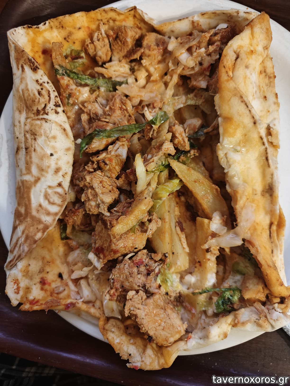 Λεπτή πίτα που την κρατσάνισε στο ψήσιμο, λεπτό το τυλιχτό στο σύνολο, και κυριαρχούσε το λεμονογιάουρτο, που με τρελαίνει, με την οξύτητά του. Μάς άρεσε πολύ. Ίσως χωρούσε λίγο περισσότερο κρέας, αλλά ήταν μια χαρά. Υπόψη ότι οι τηγανητές πατάτες ήταν μπαγιάτικες προκάτ, κι ευτυχώς τις αποφύγαμε.