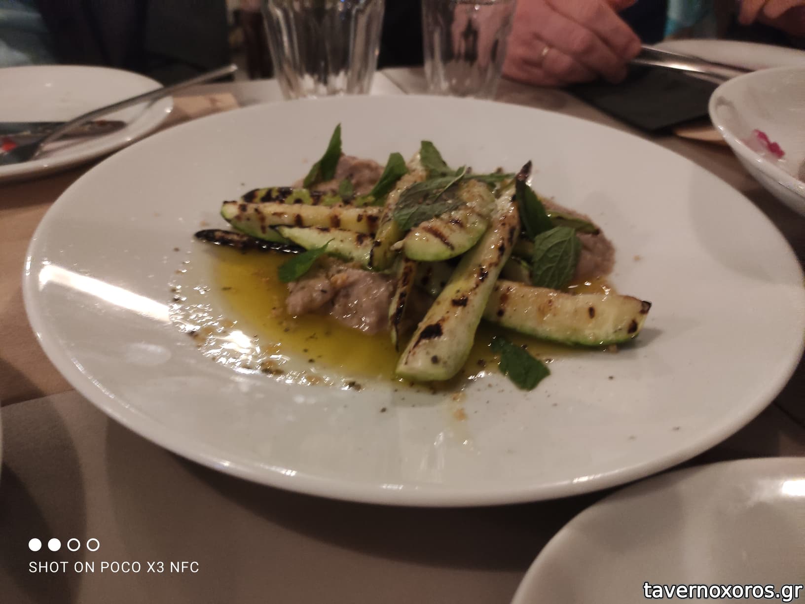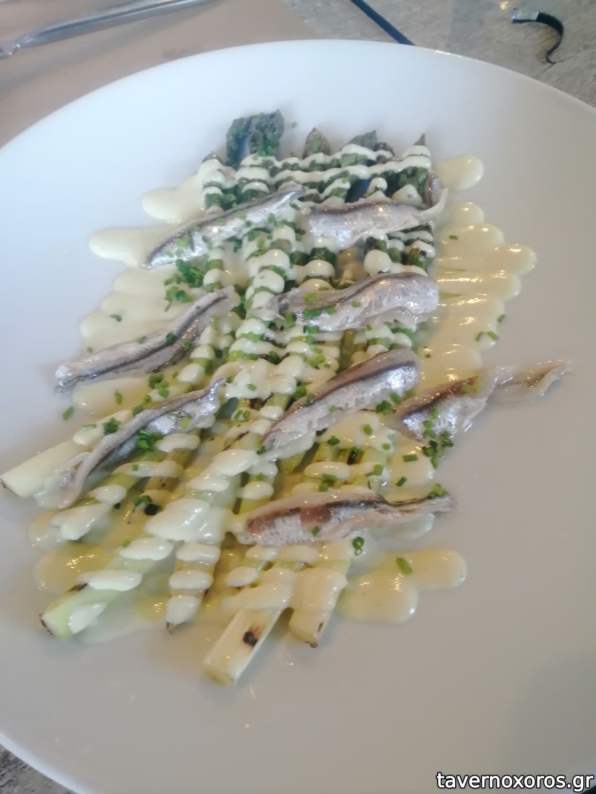"Σπαράγγια στη σχάρα με ajo blanco και γαύρο μαρινάτο (11€, ωραίο)