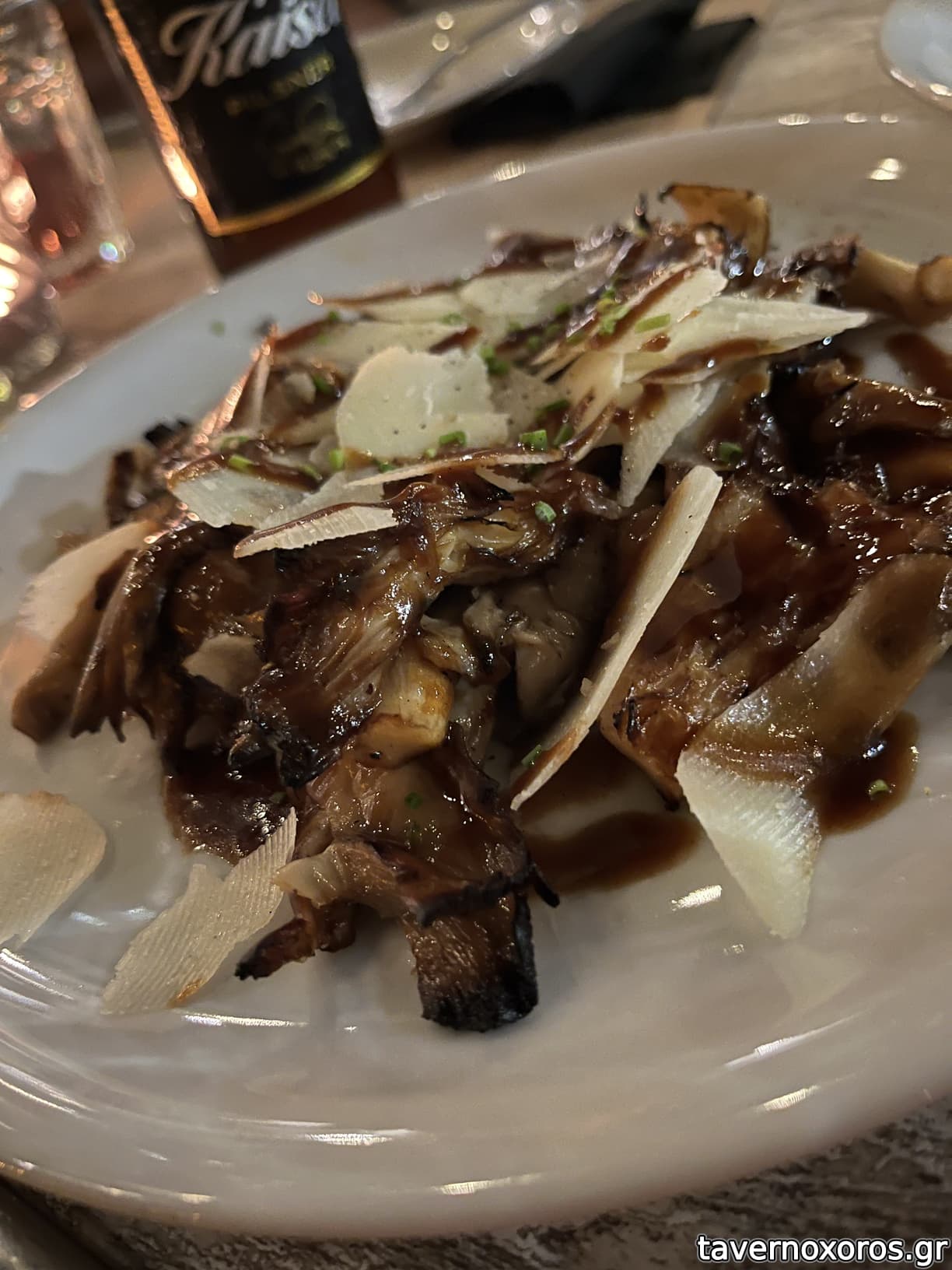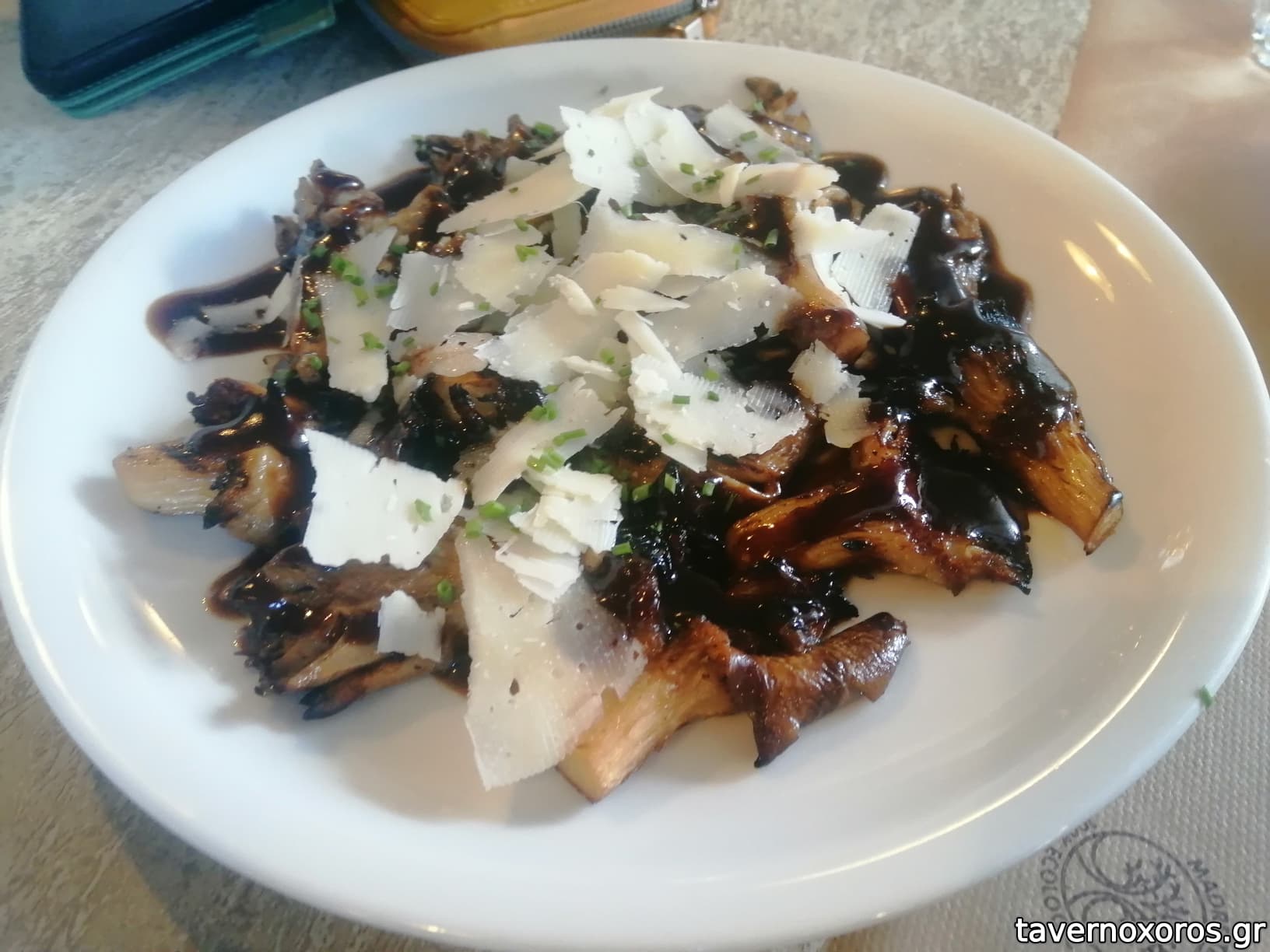 "Μανιτάρια στη σχάρα με συκόμελο και πεκορίνο Αμφιλοχίας" (9€, πολύ καλά)