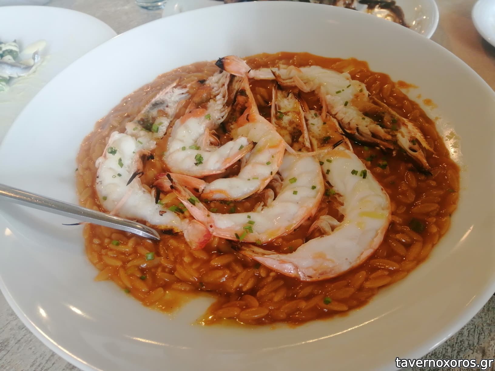 "Μανέστρα με γαρίδες Καβάλας, μαγειρεμένη με ζωμό και λάδι βασιλικού (17,5€, απλώς καλό)